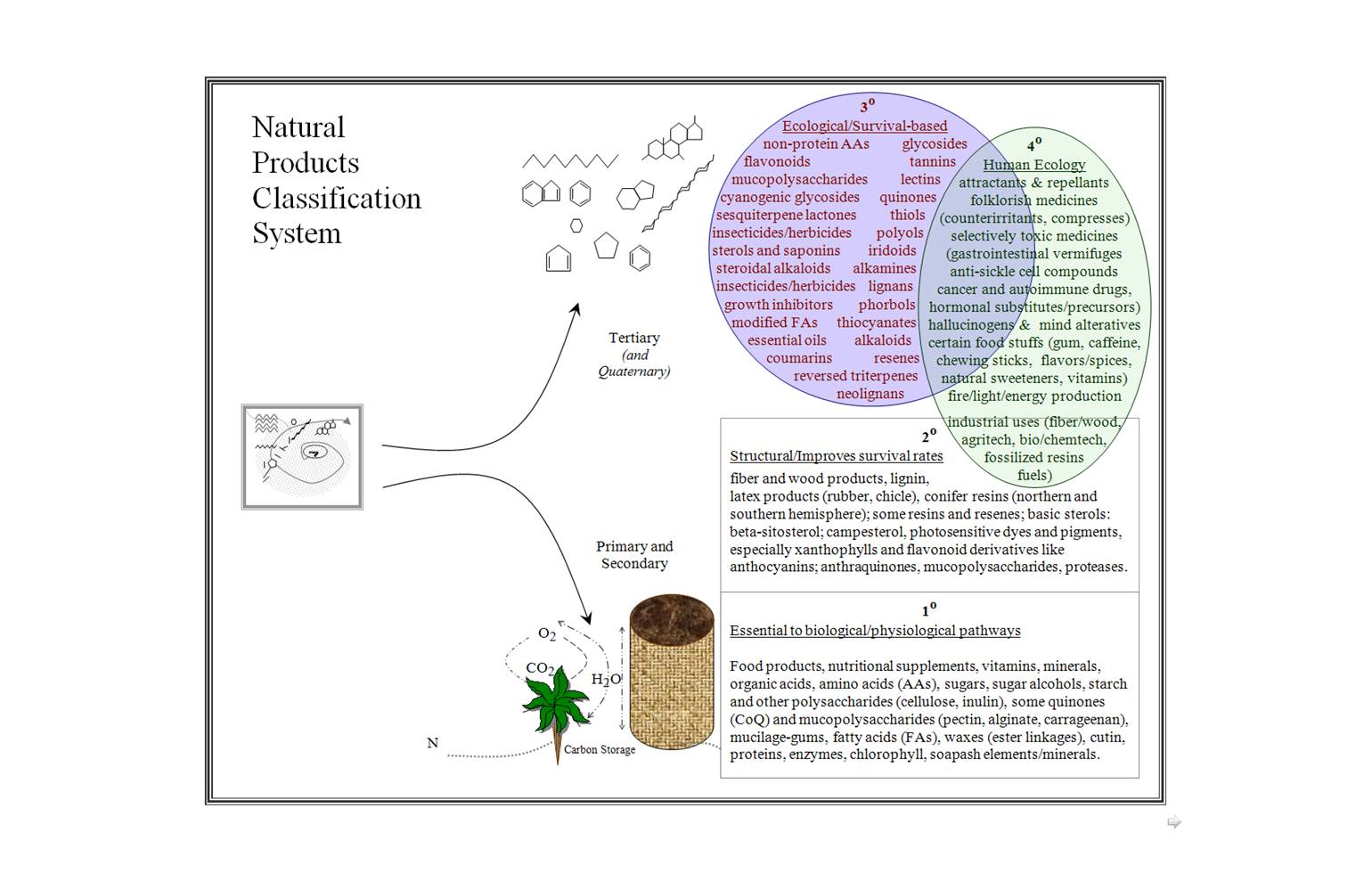 The best way to review secondary natural products in plants is to view their development at three levels.