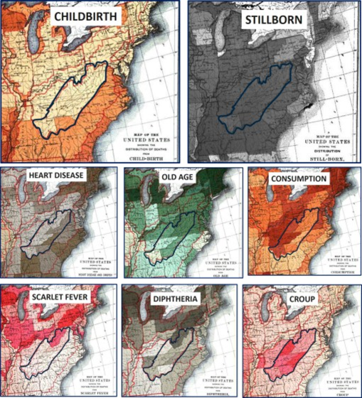 The disease maps in the 1890 Census provide us with some of the best insights into American medical history just after the bacteria was discovered. Disease mapping was about to experience a major change in significance, as scientists began to focus on the microbe, something you did not easily map. We started to focus a lot on population health, due to the development of the sanitary theories for disease popular from the 1870s onward. This is from a page I posted on the 1890 Census Disease maps, a part of which is focused on the health of Appalachia, where some of the poorest parts of the United States still exist today.