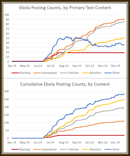 For this study of the Ebola topics referred to in the illustration here posted, the line charts demonstrate the periods of different behaviors related to this outbreak. I categorized the articles content in what I call: [RED LINE] the warning period (people like myself voicing our concerns/need for an immediate WHO/CDC response), [ORANGE] articles that focused on the CDC, WHO and agencies being and acting as though they were unprepared for the outbreak (even months into it), [GREY] the articles in which public and professional criticisms about this lack of preparedness emerged, and [YELLOW] the articles occasionally posted focusing just on the official reactions to these criticisms by WHO, CDC or the attached governments.