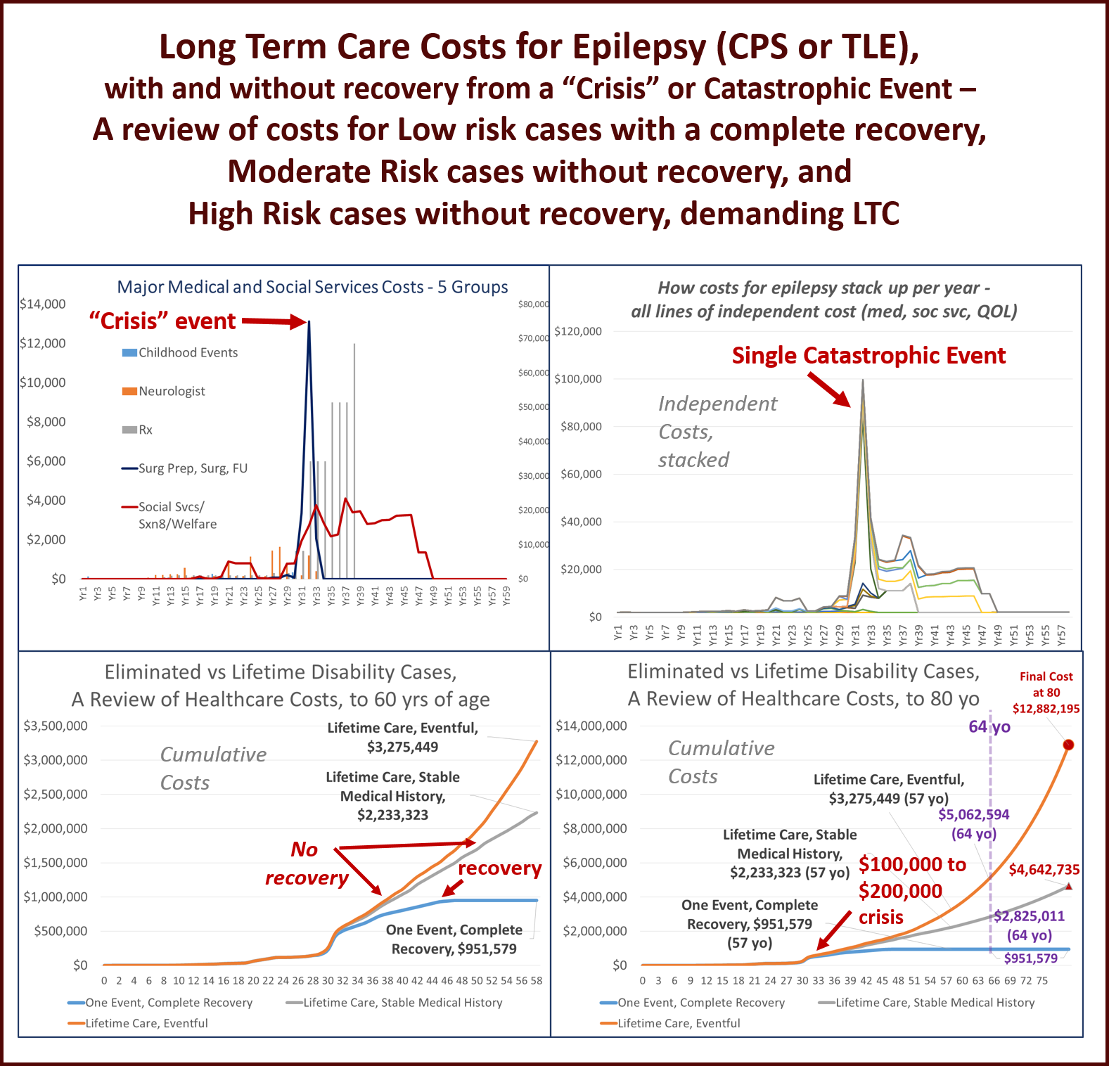 The results of this study demonstrated that the long term cost for lifetime care for a patient with epilepsy, who reaches the age of 80, but requires special housing in the later years due to long term complications, could easily reach 10 MILLION DOLLARS (much of this due to long term care demands).