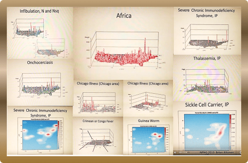 My method of developing the first videos to display the national distribution of these diseases, individually as well as as a collective, appears much like a GIS, but it was produced without GIS software. I designed my own algorithm for this 3D mapping methodology eons ago.