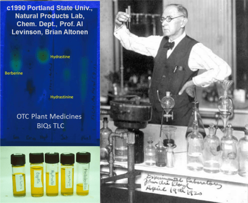 Since I specialized in BIQ alkaloids back then, I reviewed the “curative” BIQs purportedly in Goldenseal (Hydrastis canadensis) from 1990 to 1993; I presented these findings several times, including at OAS. I found that hydrastine (green to gold on the TLC) rapidly decays to produce hydrastinine (sky blue). Different products had different amounts of hydrastinine produced, indicating substantial irregularities within the herbal medicine trade.
