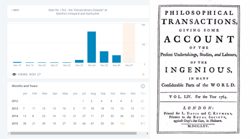 A few days ago, November 24th, I had 450 people visit one of my historic medical geography pages. This page reviewed the epidemic that stuck Martha’s Vineyard in 1763.