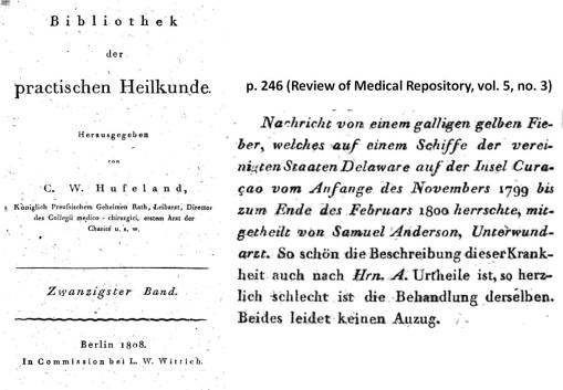 Congressman-to-be Samuel Anderson theorized the possibility that yellow fever was being carried by ships. On one of the ships he managed as a ship surgeon, he documented the conditions that existed and he suspected may have been related to an epidemic brought up from Curacao to Delaware. This is from my page on this topic https://brianaltonenmph.com/gis/historical-disease-maps/yellow-fever/samuel-anderson-and-the-mystery-of-yellow-fever-on-board/