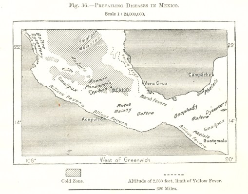 A map of the diseases of Mexico, from a World Geography set ca. 1897. The history, meaning and anthropological, cultural interpretations of these diseases and their distributions is extensively reviewed at my page on this map’s history.