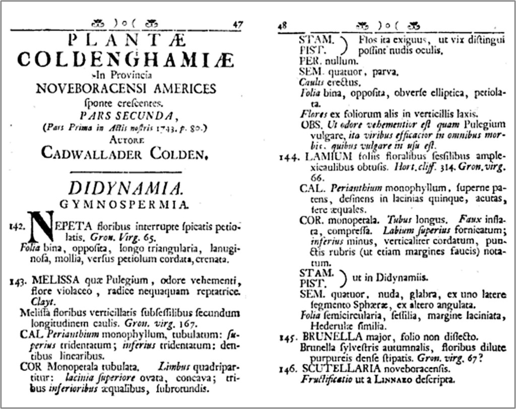 Thus, one of the most important outcomes of this work is/was my ability to translate and add knowledge to the very first publication of the Flora of New York, by Cadwallader Colden. It was submitted by Gov. Colden to one or more of his “associates” in natural science, leading to its hand to hand transfer across botanists, until it reached the desk of Carl von Linne. Over the next two years, it was transformed and readied for publication by Linne, and became a formal written scientific document, published in two parts, the last portion published 1751. This represented the synopsis of work Cadwallader, and his daughter Jane had done, between about 1738 and 1745.