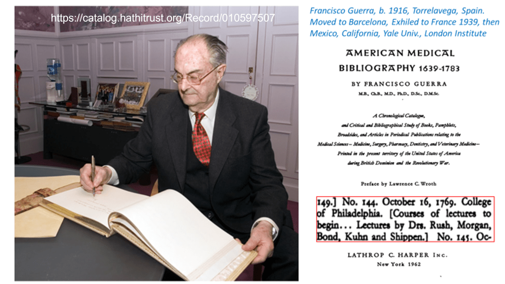 Another highly important discovery I made while researching Colonial to Revolutionary War medicine on the internet, was my review of some work engaged in by an underappreciated history of medicine scholar: Dr. Francisca Guerra. His writings in the history of Medicine were in Spanish, but he was forced to leave Spain due to political problems in the mid 1900s, and so removed first to parts of Western Europe, then South America and Mexico where he served as professor in medicine and history, and later transferred to the US where became an emeritus professor and history of medicine expert for Yale for his latter years. It was during that stay at Yale, that he catalogued the entire newspaper collection of the colonial to early post-colonial U.S. years, focusing upon anything that dealt with health and medicine published mostly as advertising, medical orders, announcements, notices to potential students, ad infinitum. This end product also had photographic replications of the majority of these ads and notices. This document alone takes a researcher at least a month to thorough review, for your colony, province and state. It provides the most widespread details on the practice and learning of medicine for this time. Its lack of review by most history of medicine researchers these past 30 years, is why many of the common myths about medicine and colonial doctors, at the time the War began, are repeatedly misstated in the majority of articles and descriptive writings produced about later Colonial-Revolutionary War medicine, with a focus on the practices of Bard, Rush, etc. Much of what historians need to know about Revolutionary War medicine, has never been shared, and what is or has been shared, remains very Anglocentric.