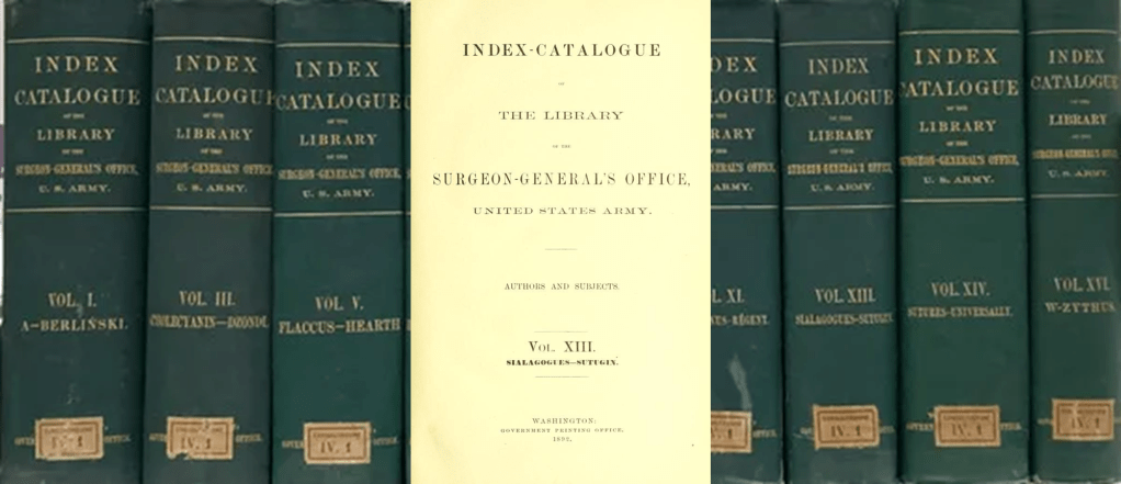 My most important resource then was the series of book documenting the holdings (“Catalogue”) of the Surgeon General’s library in Washington DC, a 35 volume (one per year, A-Z in sequence per printing) encyclopediac set of all materials perhaps ever published on medicine. I spent 3 to 5 years reviewing this set and used this reference to order more than 5000 articles out of my University Library (Portland State University), during my years as a graduate student there–1996 to 1998. I received about 50% of these requests.