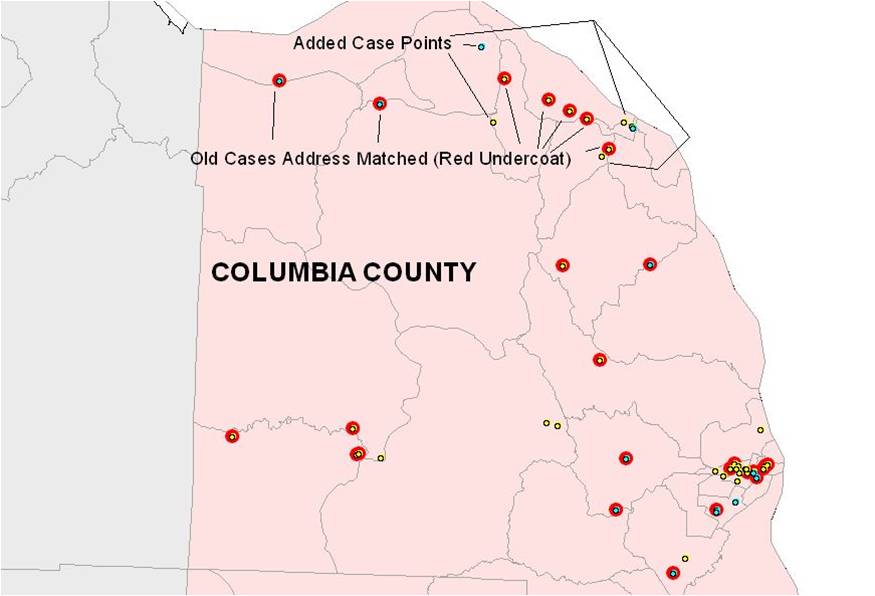 Red Dots are cases successfully address-matched; blue and yellow represent new cases added to dataset through the use of a second address matching tool or manually