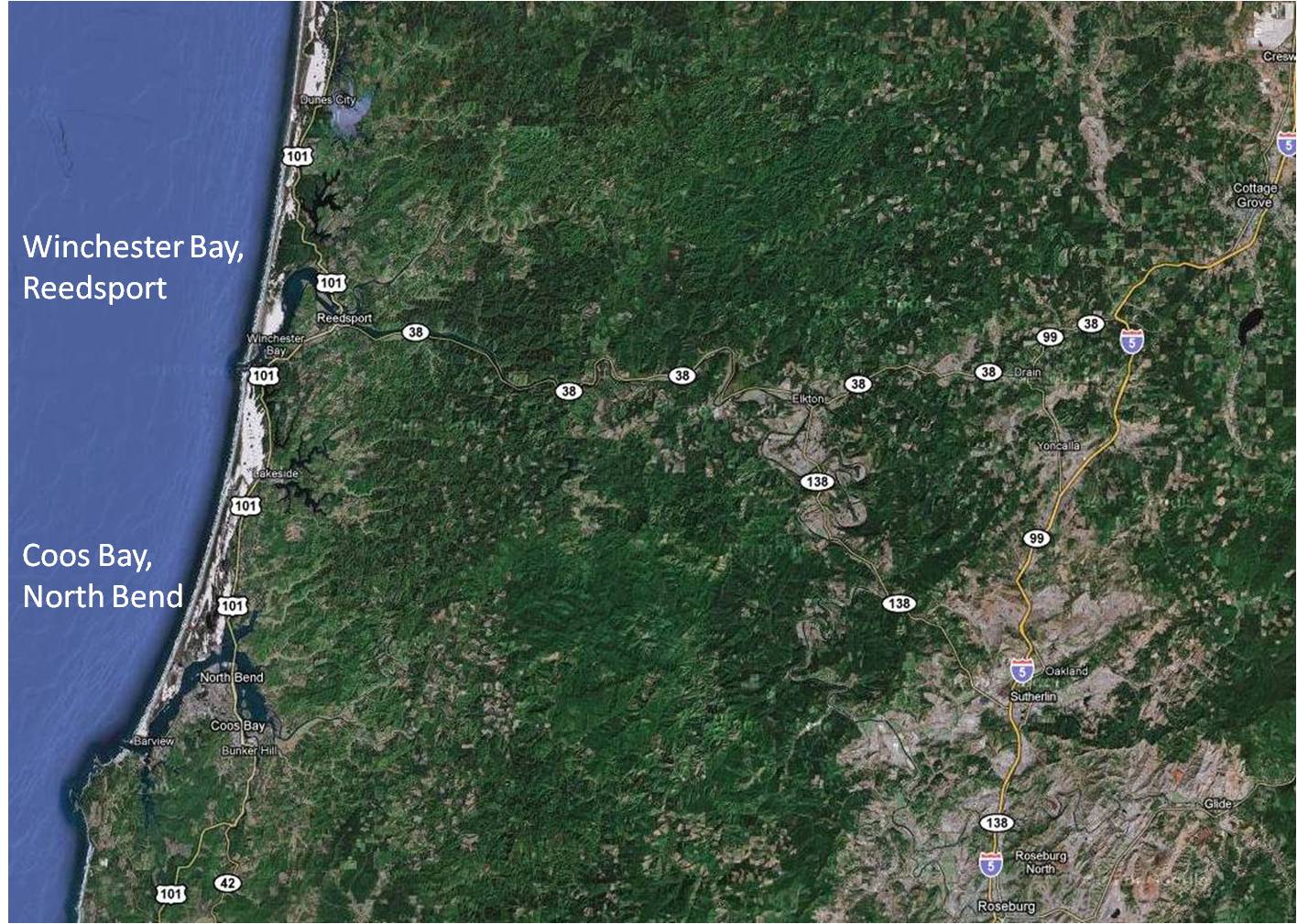 From north to south the major townships go Reedsport (Winchester Bay), Lakeside, North Bend (Coos Bay), and Bandon, with Coquille further inland.