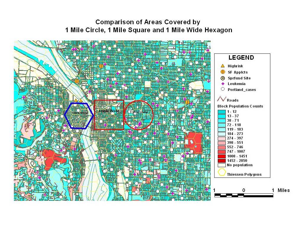 Early Example of Theissen Polygon Use. Distribution of people and cases across 4 NW counties was evaluated relative to four sites with a history of release of highly toxic metals.