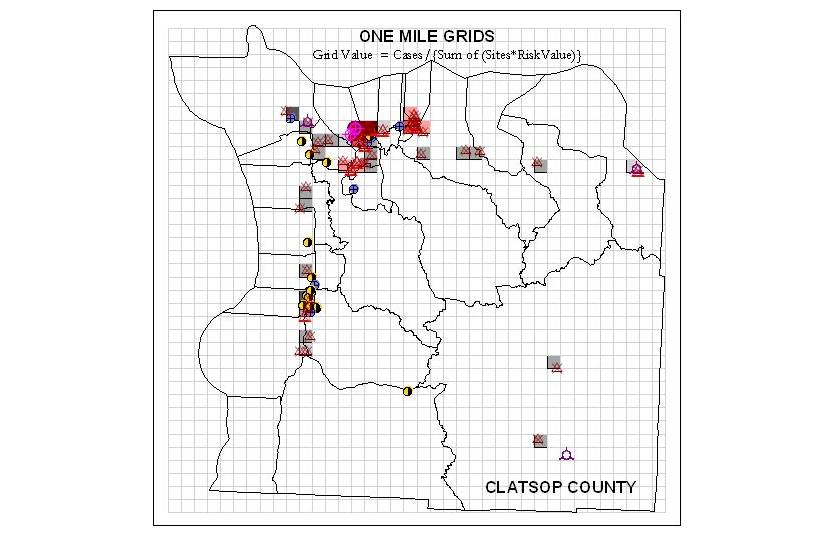 With these chemical signatures now defined, the issue became evaluating one site relative to the next, with various cancer cases in close proximity to both of these sites. A single case could be related to one or more sites. So how did local incidence or frequency in relation to areal chemical release history play out spatially was our next question. This led to a statewide gridmap produced the old-fashioned way, using an Avenue extension, and a grid developed for the entire state of Oregon based on 1 mile x and y side lengths for each grid cell. The grids were evaluated for cases per cell, and that data tranferred to a centroid point file developed to replace the grid. Finally, these point values were used to produce an isolines maps. This 8 to 10-hour process relied on four Avenue extensions programn and led to the development of the cancer case isoline map displayed below and detailed elsewhere on this blogsite.