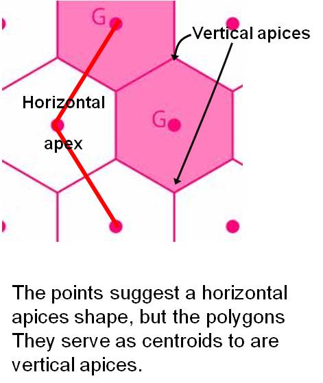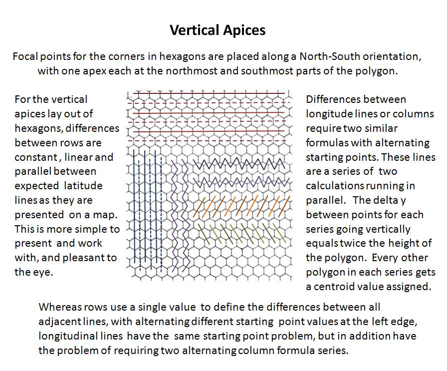 When planning a project in which you want to map everything out using hexagons instead of square grid cells, it helps to keep in mind that there in an inverse relationship between points and polygon shapes. The production of points that lay out on a map like vertical apices hexagons, once they are treated as centroids and used to produce a polygon file, results in a vertical apices polygon shapefile. The production of a series of points that suggest a vertical apices gridform, will once the polygon map is produced, displayed as a horizontal apices polygon shape file. (Thus, my horizontal apices hexagonal grids are produced using a series of points that appear as if they are of vertical apex form.)