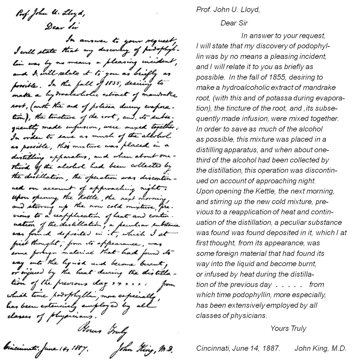 John King’s letter to John Uri Lloyd reminiscing on his famous discovery of the concentrated extract.