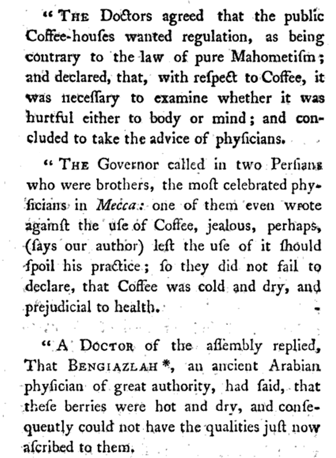 The healthiness of coffee houses had already been tested in the Middle East near Mecca. The Judicial leaders in local towns had to deal with whether or not coffee was a beverage allowed by traditional kosher law, and just how moral the social aspect of this tradition could be. Coffee houses were a common establishment in these communities and their effects upon the local religious practices were queried, resulting in the following summary of their impacts on local religious tradition published as part of the 1792 treatise:
