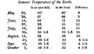 ” The real truth seems to be, that when a country is covered with forest, the vibrations in the temperature of the air and of the earth near the surface, are less numerous, and less considerable, than in an open country. Dr. Williams himself has furnished the data by which to determine this point. In 1791, he found an open field froze to the depth of three feet five inches; at the same time, in a forest, he found the temperature of the earth, to be 39° by Fahrenheit, seven degrees above frost. This fact solves the question here discussed.
