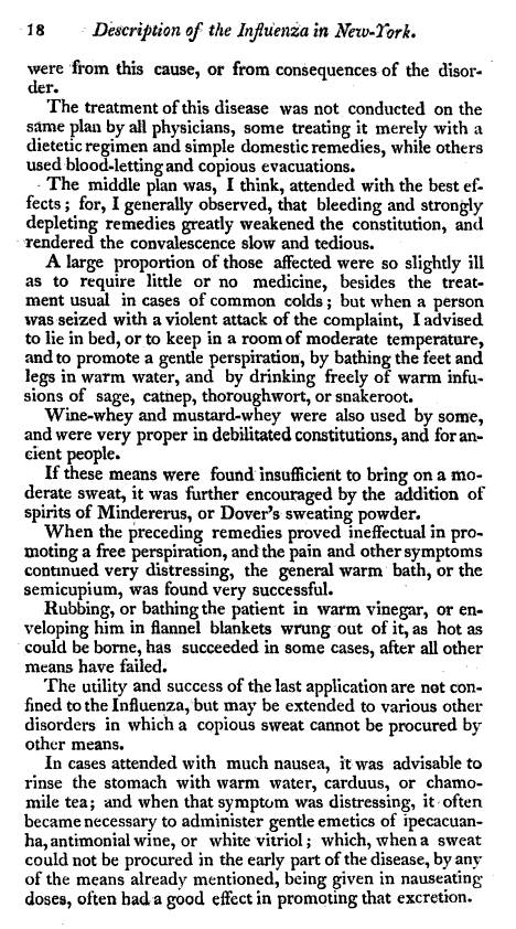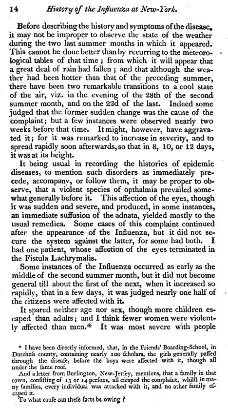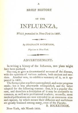 Following his responses to the Circular, Ricketson also received responses from physicians located as far away as the Northwestern part of the State near the Canadian border. This led him to study to geography of influenza as a climatological phenonenon and then published his findings both in the form of a pamphlet and as an article in Medical Repository. The front page of the pamphet is provided, followed by the complete article that was published, in text format.