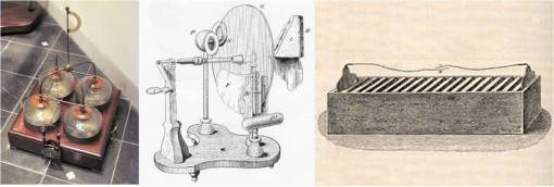 Like the Leyden Jar, a multiple sphere apparatus could be produced based on the above device. By producing friction using several spheres, more static electricity could be generated and stored. This energy could then be transferred via a chain to what ever was in contact with its end. In the case of the above model related to an invention produced in the 1760s by an Albany engineer, the individual to the right is standing on a resin block which insulates him from the ground. Anyone who makes contact with his hands is grounded and therefore receives the medical electricity. This type of humorous practice was sometimes engaged in at fancy outdoor parties and such, and on occasion for providing some form of “healing” or “preventive power,” for example an activity once sponsored by Benjamin Franklin referred to as an “Electric Picnic.”