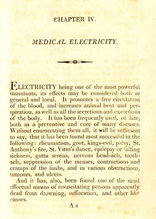 “Medical electricity in all its various branches, which has proved very beneficial (when judiciously managed) in various diseases, particularly in those arising from obstruction and nervous affections, and which has perfectly cured many Chronic distempers, performed with caution and skill, acquired by long experience.