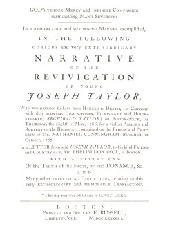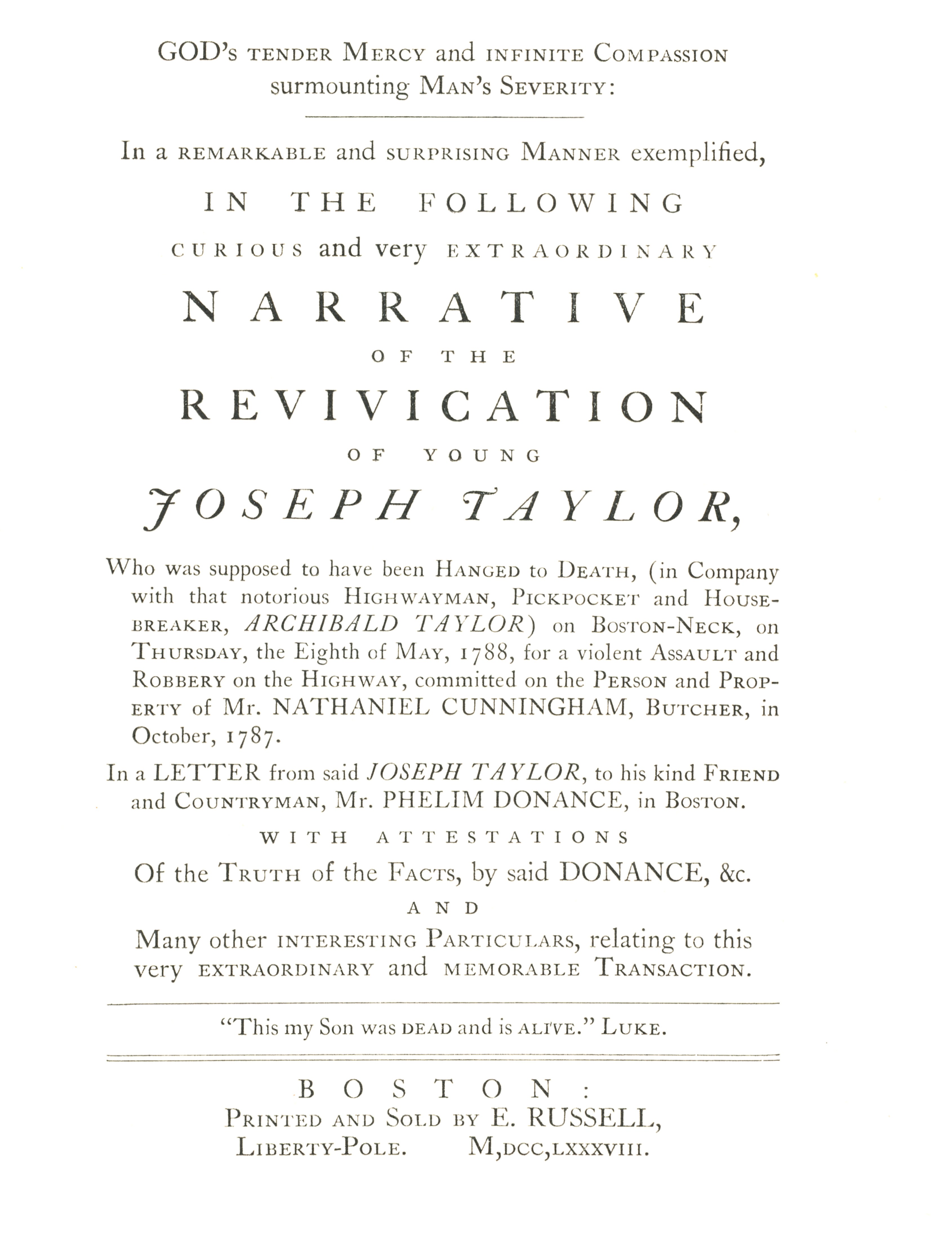 As proof for evidence of this claim that Ricketson was influenced possibly by some of the local writings, as well as by his experiences, one needs only go a few years back in time, to review some fo the stories told when Shadrach was a child. The most important of such stories about the value of life was that of a prisoner in Boston, sentenced to be hanged to death for a crime he committed. During this time, in Ricketson’s youngest years and throughout his adult years, a popular ‘vital force’ or ‘energy’ related concept dealing with the body and its ability to live and move pertained to the Animal Spirit, which was in charge of most of the body’s parts, and the “soul” and related “spirit” related to the Brain. This philosophical notion is also noted in Cheyne’s book on ‘Health and Long Life’, a book which Shadrach based his own writing plans and style upon. In Cheyne’s book, medical philosophers and physicians believed the brain and mind were controlled by the “Soul” or “Spirit” (as Cheyne referred to this), and had to do with some sort of direct communication or relationship with the Creator or God (for religious believers), or if your were agnostic/atheistic and in tune with the local Newton-Colden letters and writings about Isaac Newton’s philosophy and findings, the Natural Universal elements. For the time, one of the better known pamphlets published on this happening related to a recovery from suspended animation was The Wonderful Monitor: or, Repository. Containing A curious and most astonishing Account of the Revivification of young Jo. Taylor, printed and distributed by E. Russell of Boston in 1788. But the story this pamphlet tells begins one year into Ricketson’s newborn life, 1767.