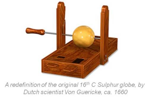 Disk Generators. Disk generators were perhaps the most popular form of electric cure. Their uses in medicine started with the Hauksbee apparatus around 1709, a device which had a handle used to spin the disk, which through a belt helped to turn a glass globe being rubbed by leather; this friction of the leather against the globe is what produced the static electricity, which was stored by the glass globe. This energy was then discharged upon contact with the glass globe on top, or through some device that served as a cord-like conductor.