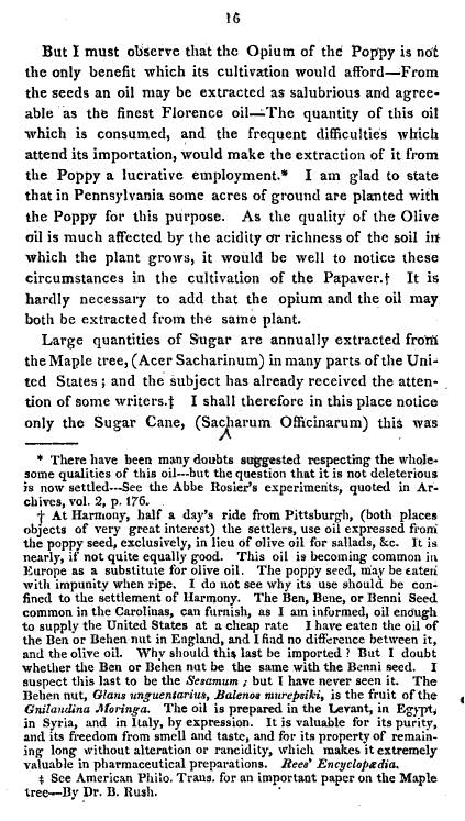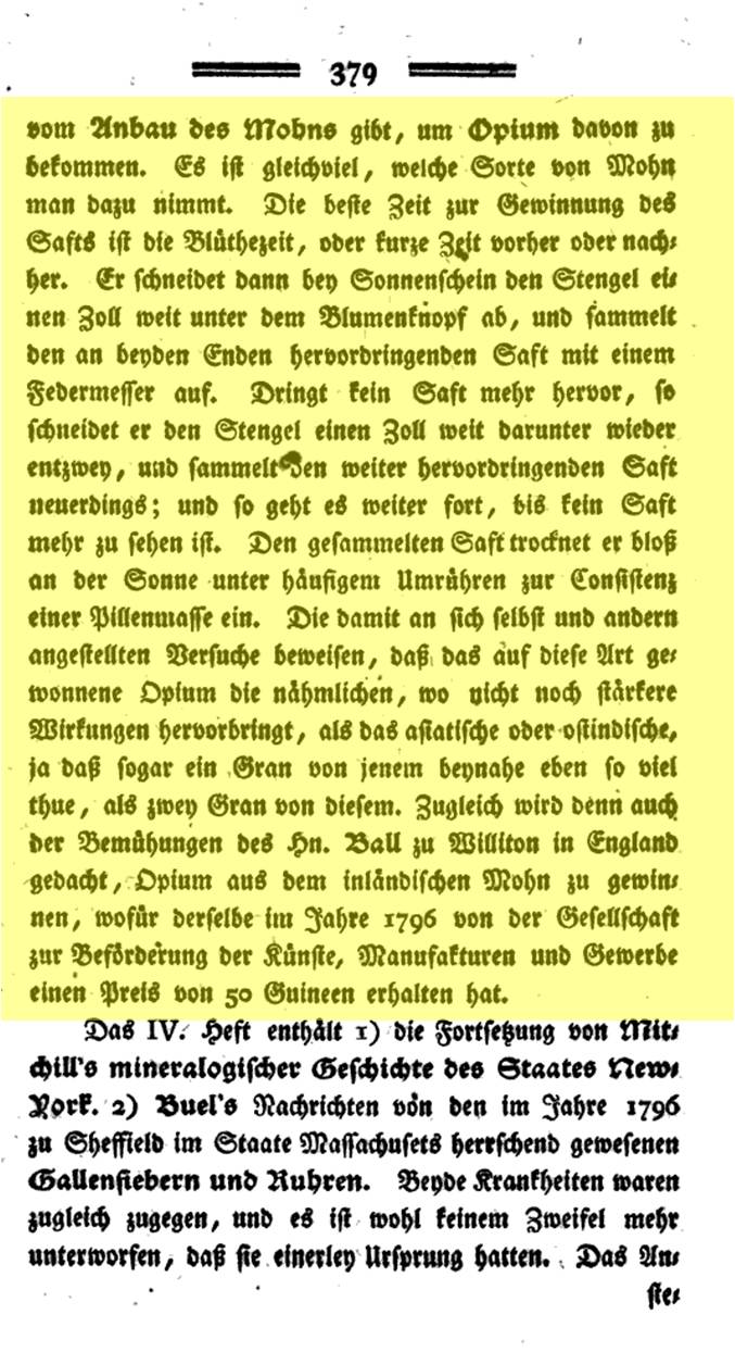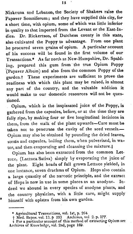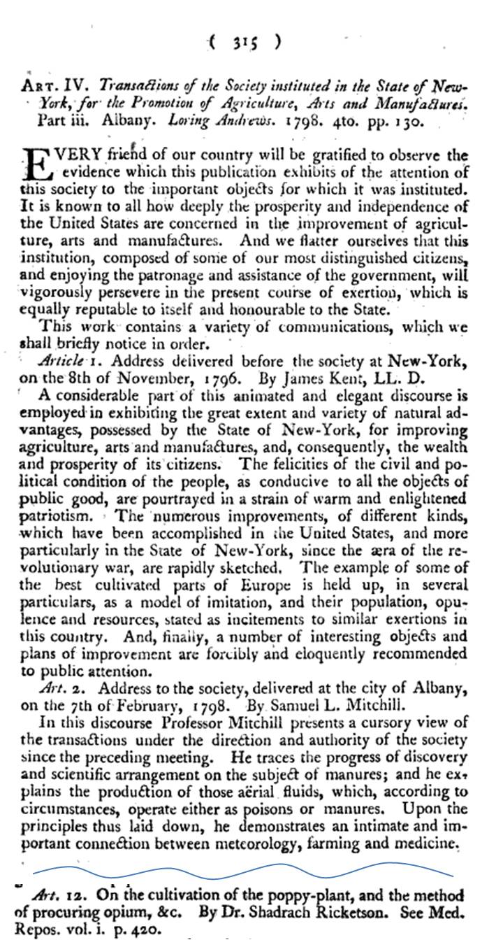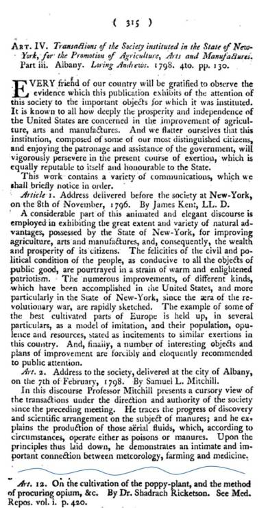 The first item, in German, tells us about this event and discovery of Ricketson in 1799. Yet we hear very little about this part of his life for years to come. By 1806, Ricketson’s “discovery” and recommendations about planting Papaver somniferum locally, finally received the support it has earned. Like his book, this delayed recognition is in contrast to later Quaker discoveries of equal moral value, although influencing greatly different socially important issues, such as slavery or the rights of prisoners. Yet, as a Quaker, Ricketson was very much an open-minded physician practicing religion. His respect for religion in general is demonstrated by the relationship he developed with one of the more innovative religious communities for its time–the Shaker Village up in New Lebanon. According to early medical botany historian Jacob Green, Ricketson and the Shakers made Papaver somniferum a staple crop of New York.