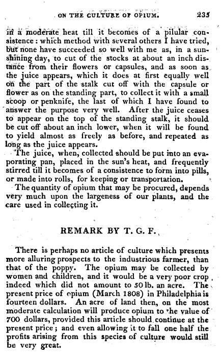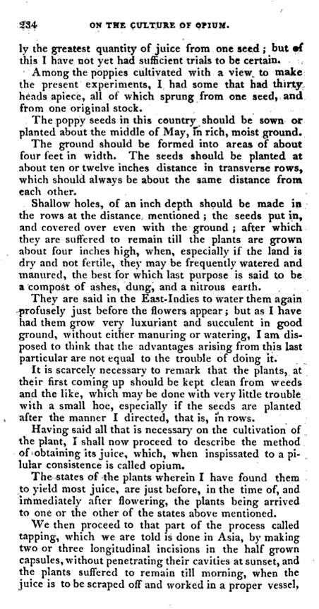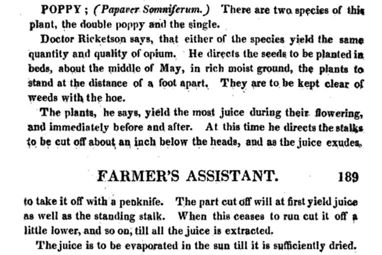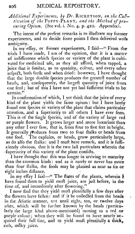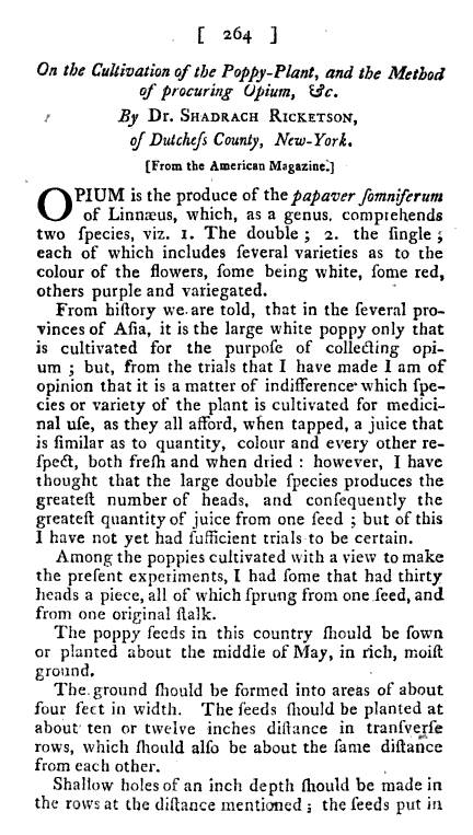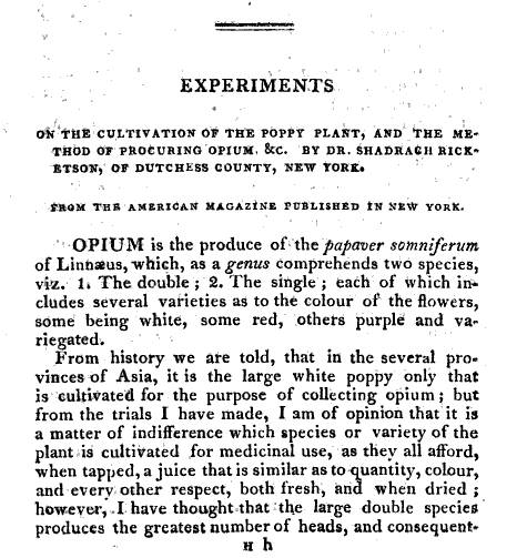 The following is the first article Shadrach Ricketson wrote on Opium. This article is scarcely mentioned in any writings on Shadrach Ricketson, and the general impression of Ricketson’s writing about Papaver is that his articles or pamphlets focused on technique for growing this plant. But once one gets several paragraphs into this article, one can see it is very different from all of the later items published about his work. This article consists of recounts of his first hand experiences experimenting with the use of opium, amazing for both the period of time in American medical history it represents and the new knowledge. . . and wisdom . . . Dr. Ricketson developed due to his experiments.