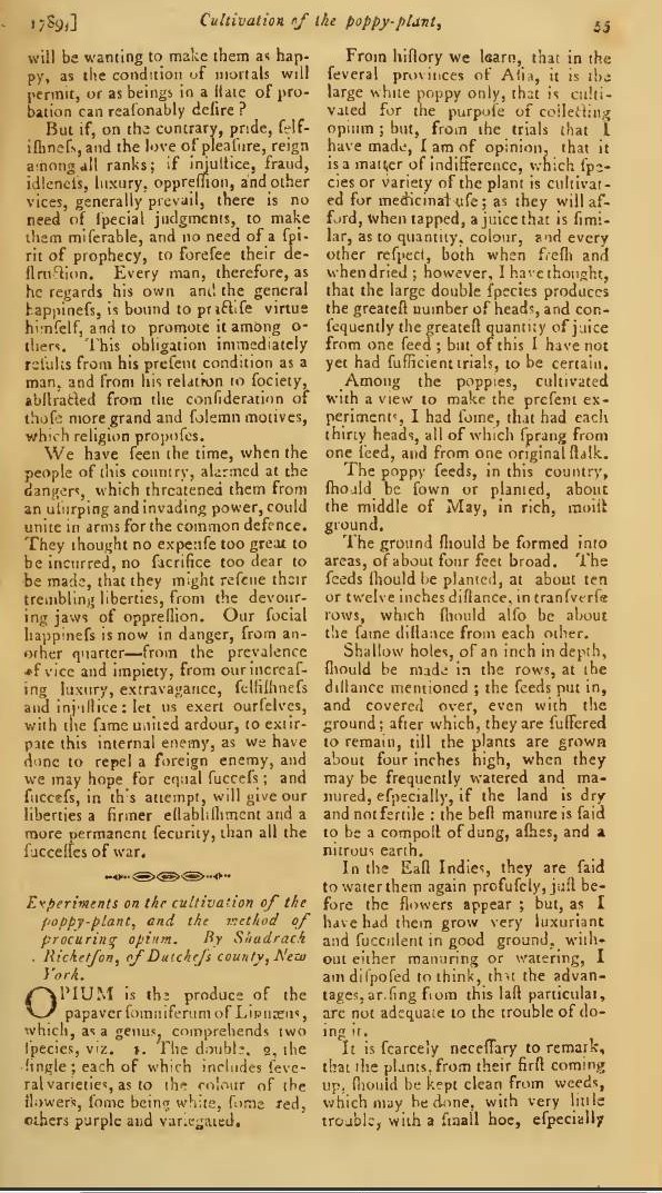 Numerous events related to the North American poisonous plants like the numerous cacti, james town weed, locoweed, and tobacco, had mixed effects upon the European cultures trying to duplicate the Native American uses of these plants. Meanwhile, in the midst of the gathering of this new ethnobotany information, Shadrach Ricketson was seeing Opium in his own way as a Quaker and a physician. Ricketson’s view of opium was that it was a plant that could possibly be cultivated in the United States, given the right growing conditions and set up for raising such a foreign species. Exactly how and why Ricketson decided to ask and answer this question himself came about as an experience he had with the Turkish opium during the 1780s, in which he kept a journal detailing his experiences as a user. This article is barely ever cited, and was published in a fairly unknown common reader’s magazine for the time. Yet this description by Ricketson of his journey with Opium tells us he was not only exploring the use of the drug plants as a substance influencing the body, but also a means for reaching deep within your chest, heart or brain, with the hopes of finding the personal soul. A Quaker might indeed think this way, if (s)he understands and believes in God as spirit, and God as the source of life, the cause for Universal Electricity, or as Quakers in Ricketson’s group called Him, the “Universal Light.”