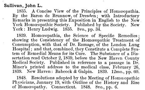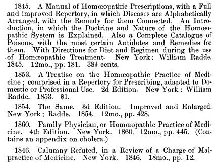 Note: the following bibliography was pulled from the Google text version of Homoeopathic Bibliography of the United States, from the year 1825 to the year 1891 Inclusive by Thomas Lindsley Bradford. (Philadelphia: Boericke and Tafel, 1892) [pp. 101-127]. It was superficially proof-read, mostly for blatant text reading errors and improvements of the initial formatting. [For Google copy see this LINK]