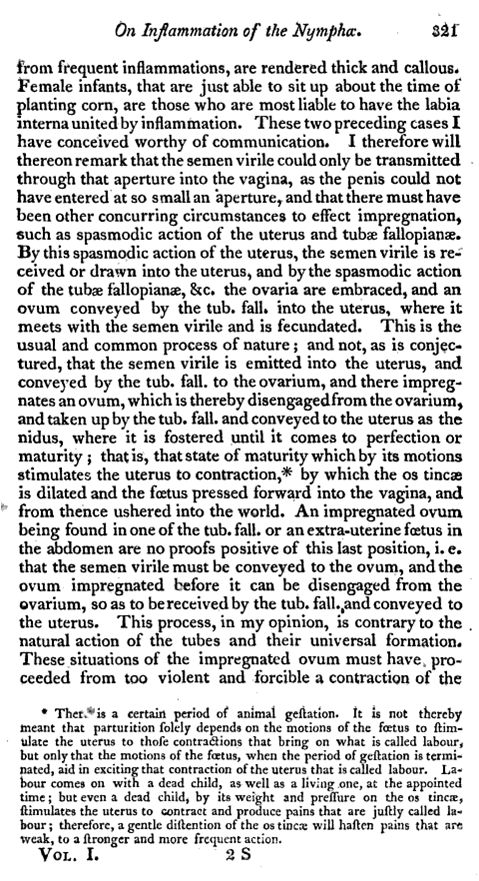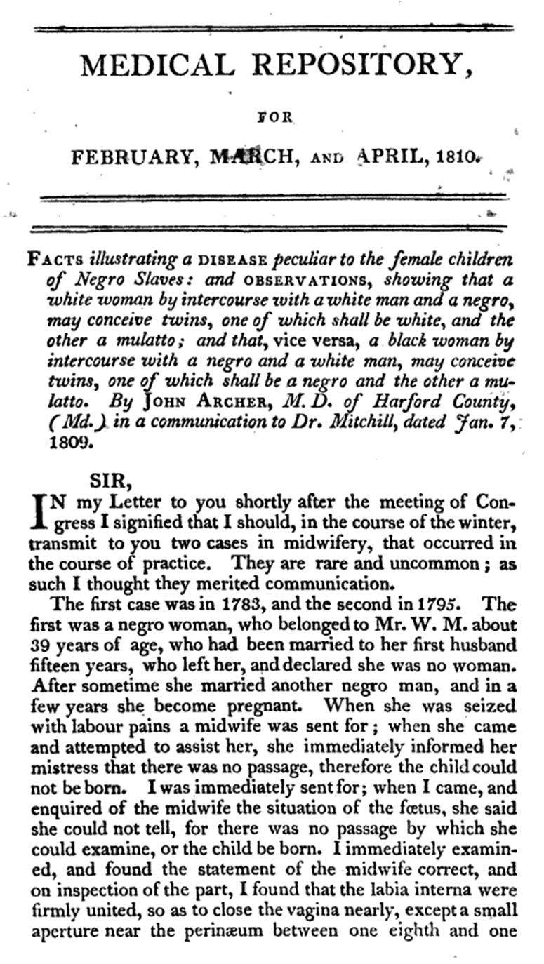 The following is perhaps one of the most interesting articles I uncovered during my review of the early 19th century Medical Repository. It represents what is likely an early clinical review and investigation into African children who became pregnant by the time they reached their fertile teen-age years, and who could not deliver their children due to an undersized vaginal orifice (to put it lightly). According to their physical exam, the physician’s immediate review of the anatomy suggested something was missing. In theory it should have been impossible for them to become fertilized due to the size and shape of the orifice. Thus the reason for the author’s query. The cases discussed here are probably some of the earliest examples of the African practice carried out on young girls known as infibulation. With infibulation, the labia are closed for the most part, and a small opening left in order to allow for normal urinary and menstrual flow. The fact that these young women lack vaginal cavities and are pregnant suggested to doctors some very interesting social and moral issues for the time. This speculation also in turn led to a number of related clinical and biological questions, which the author provides us with his personal observations about. Aside from the obvious questions related to the practice of infibulation, one has to wonder if and how the following questions were probably considered by the physicians: