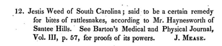 Interest in this herbal medicine grew as knowledge of other local plants became known between 1787 and 1800. The Medical Repository played an important role in the cultivation of local herbal knowledge beginning with its first publication in 1797. The article on this plant posted below is by a Mr. Haynseworth and is briefly described in the following 1831 note in a journal. According to the Medical Repository article the source for the name of this plant is a slave named Jestis.