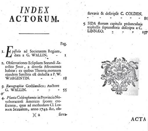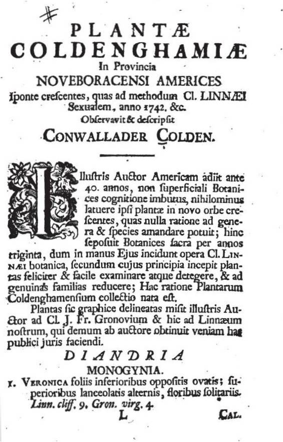 Cadwallader Colden’s dissertation on the plants of Coldenham, or “Coldenghamia” as it is spelled in the Linneaus document, was produced in two parts. His original study of Coldenhamia was completed in 1743, at which time he submitted his dissertation to the Swedish Royal Society of Scientists. The first part of this work was published in the 1749 edition of Acta Societatis Regiae Scientiarum Upsaliensis, the second part was published 2 years later in 1751.