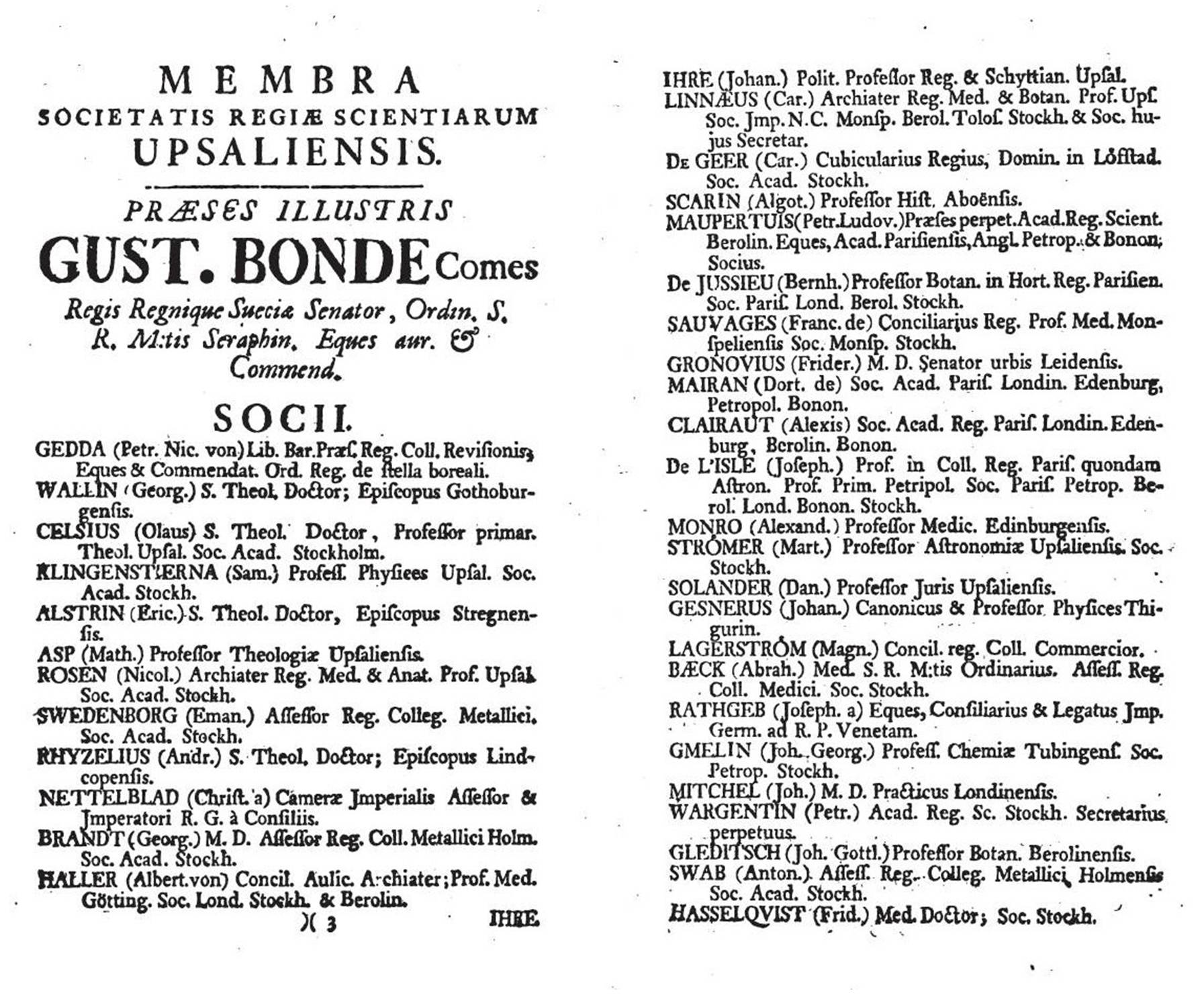 During the mid-18th century, the members of the Royal Society of Science, Upsal, Sweden, included such famous scientists and scholars as Albrecht von Haller, Emanuel Swedenborg, Carl von Linne, Johannes Gesnerus, and Johannes Gmelin. A famous botanist with the Society was Dr. Friderich Gronovius, Cadwallader Colden’s connection to the Royal Society and ultimately to taxonomist Carl von Linne. A number of other members in this society deserve mention as well, including physician Hasselqvist, whose writings in this society’s Acta provided important links we might otherwise miss between the philosophy of natural sciences and health at ths time. The works of Professor Klingenstierna typically related to the popular philosophy then brewing about electricity, physiology, disease and health, but was heavily published as a highly skill mathematician for his time. Petrus Wargentin was a skilled astronomer, who published details about the various cycles demonstrated by such events as the predictable planetary lunar orbits, and who strengthened much of the philosophy Isaac Newton’s work was resulting in during the 18th century. Georg Wallin, in his series entitled “Runographia Gothlandica“, documented the important history and his translations of the various Runes writings found on various tombstones throughout Scandinavia. The publication of “Conwallader” Colden’s work as a part of these writings placed his work alongside of the best studies every done in science during this important period in science history.