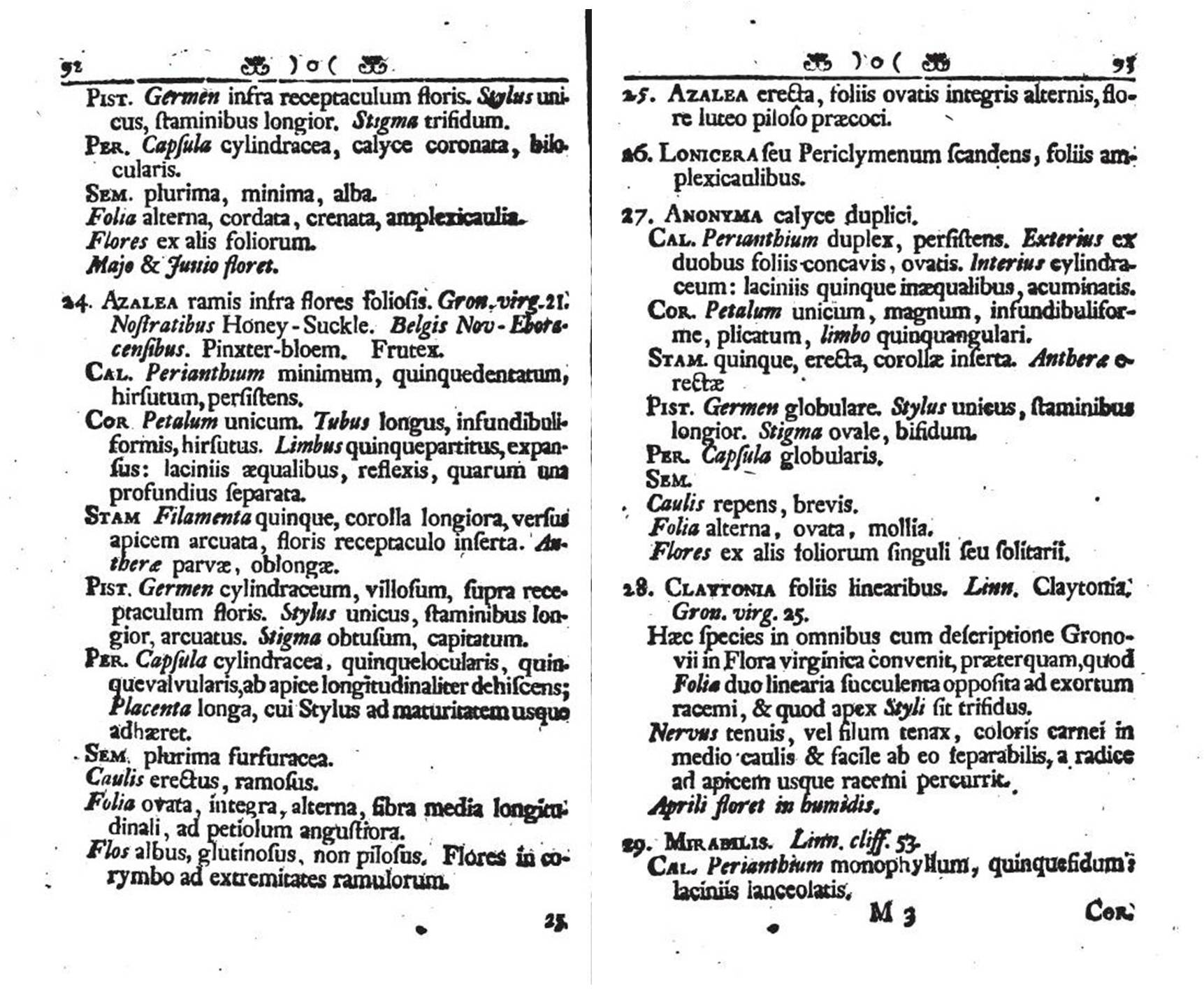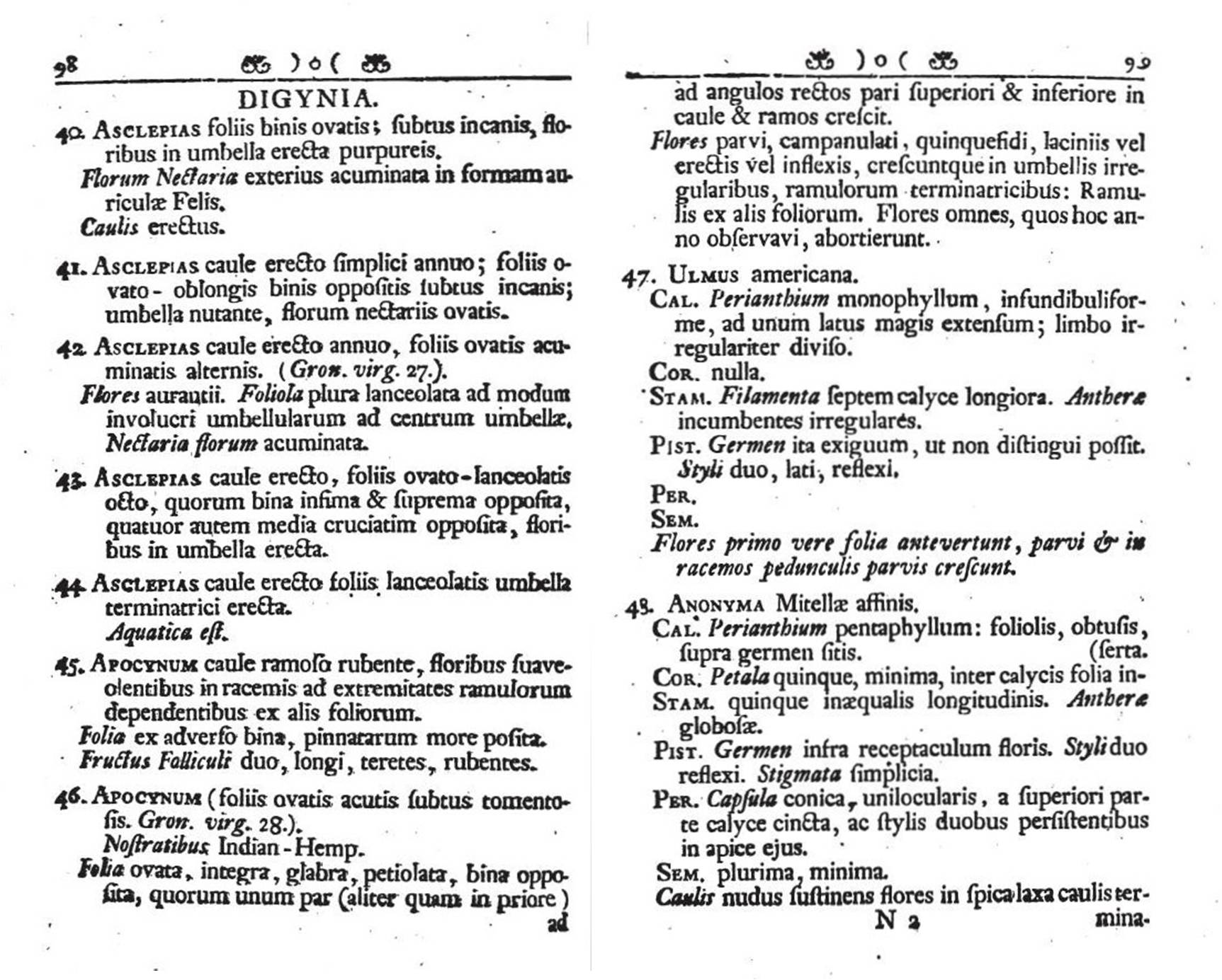 Also note in the above preface to Colden’s work, the preface author’s phrase “quas nullae ratione ad genera & species manadare potuit . . . Hac ratione Plantarum Coldenhamensium collectio nata est”. Roughly translated: ‘and so this new naming [system/art] for plants–genus and species–as part of this study of the Coldenham plant collection–is born.’ The roles of Gronovius and Linnaeus within this process are referred to in the preface and appear throughout the taxonomic work in fairly standard format for this topic of writing for the time.