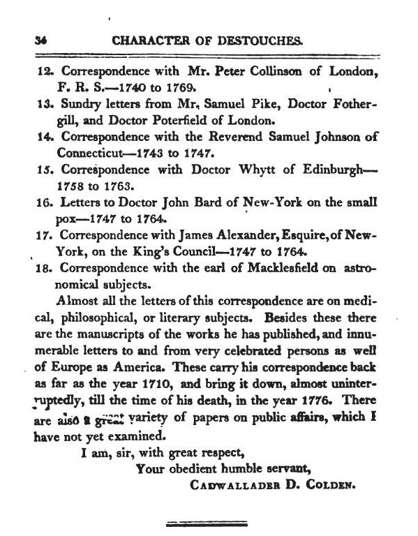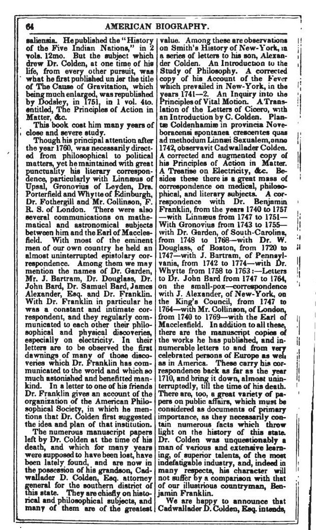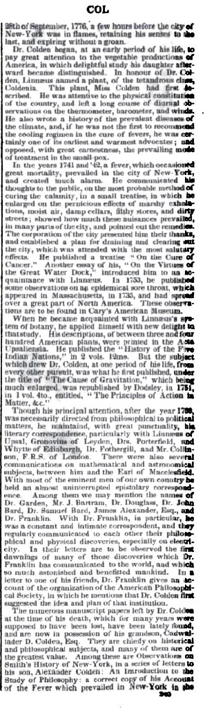 As part of this re-publication of many of these writings by the medical journals, a listing of these items was produced and published in The Portfolio. Over the years, we will find several listing of Colden’s publications in the scientific and popular press. The majority of these writings are found on this list, although subsequent studies over the years uncovered a number of items not referred to in this bibliography contained in The Portfolio. One of the most important things to note is the lack of any detailed review of the sum of these writings. Most reviews of Colden’s accomplishments in science and medicine take a fairly narrow view of the importance of his work. No complete and interdisciplinary overview of Colden accomplishments as a scholar of the “scientific enlightment period” has not been produced.