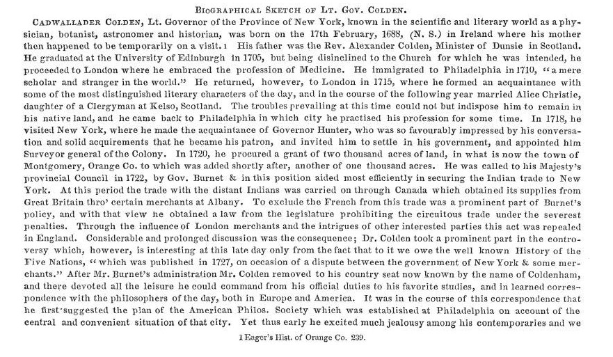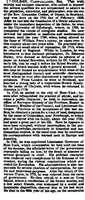 The following are very early biographies written about Cadwallader Colden. Rather than rewrite or essentially rephrase much of what has already been told about Dr. Colden, numerous times before the production of this review, these various views of Colden’s importance in local or national history as a scientist and physician are provided. these biographies provide the best insights in his early roles in American history, the purpose of providing you this information. For history’s sake, they are presented in chronological order, as they appeared in the popular and professional press.