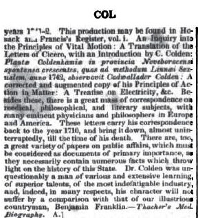 Although not a journal, Lexicon Medicum was an important information source for the general public as well as physicians. The biography provided in this reference is important due to some of the additional information it provided about Cadwallader Colden. As noted at the end of the essay, the original source of this biography is the newly published American Medical Biography by James Thacher (2 vols. 1828). Thacher often provided personal impressions into his writings on the physicians based on personal and professional experience and his association with a number of Colden’s younger colleagues during the period of Colden’s later years.