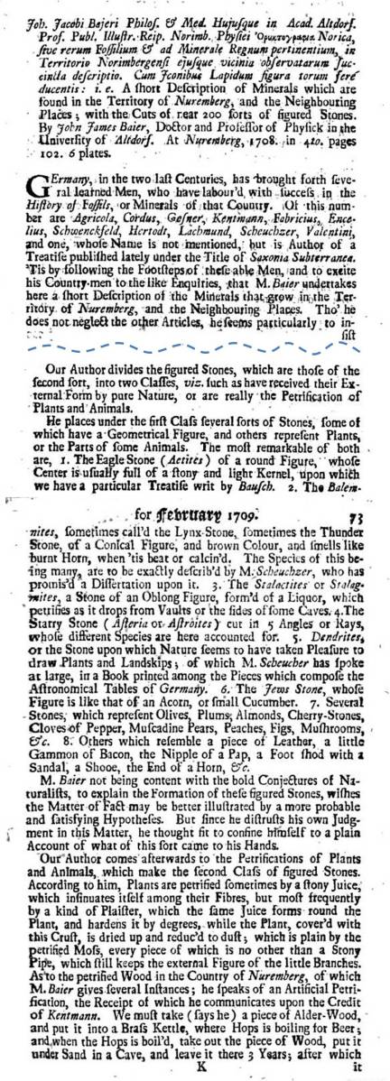 During the early 1700s, a number of areas throughout Europe were found to have bedrock and landforms with “figured stones.” An explanation for these formations led writers to refer to them as ‘effigies’. Both natural theology and natural science experts lacked an explanation for these discoveries. The following is a section of a popular journal for the time, Fugitive Pieces on Various Subjects in Two Volumes (1709, vol. 1), a book review reviewing the details of such a find in Nuremburg, Germany.