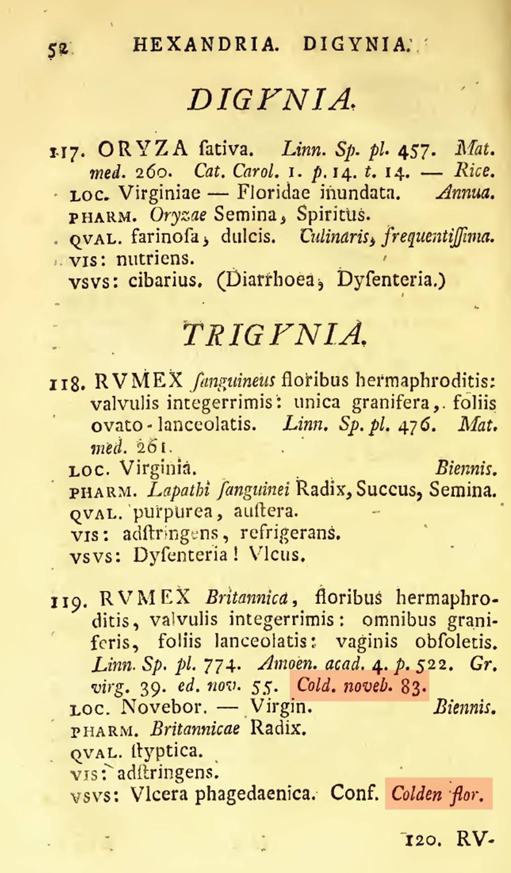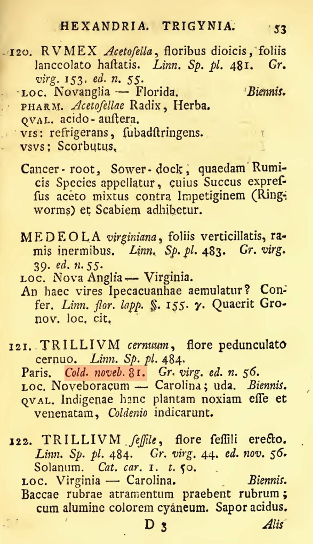 The subsequent entry for Skunk Cabbage (Dracontium foetidum . . . , now known as Symplocarpus foetidus) is worth noting. There will be a large variety of uses for this plant developed over the next few years and generations of herbalism. Colden recommends it for wounds and ulcers as an external remedy, and for coughs related to consumption (which could be anything from a simple severe cough, to cough associated with pleurisy, to an actual tuberculosis case). The antiscorbutic effect of this plant would also be passed on into 19th century eclectic medicine literature.