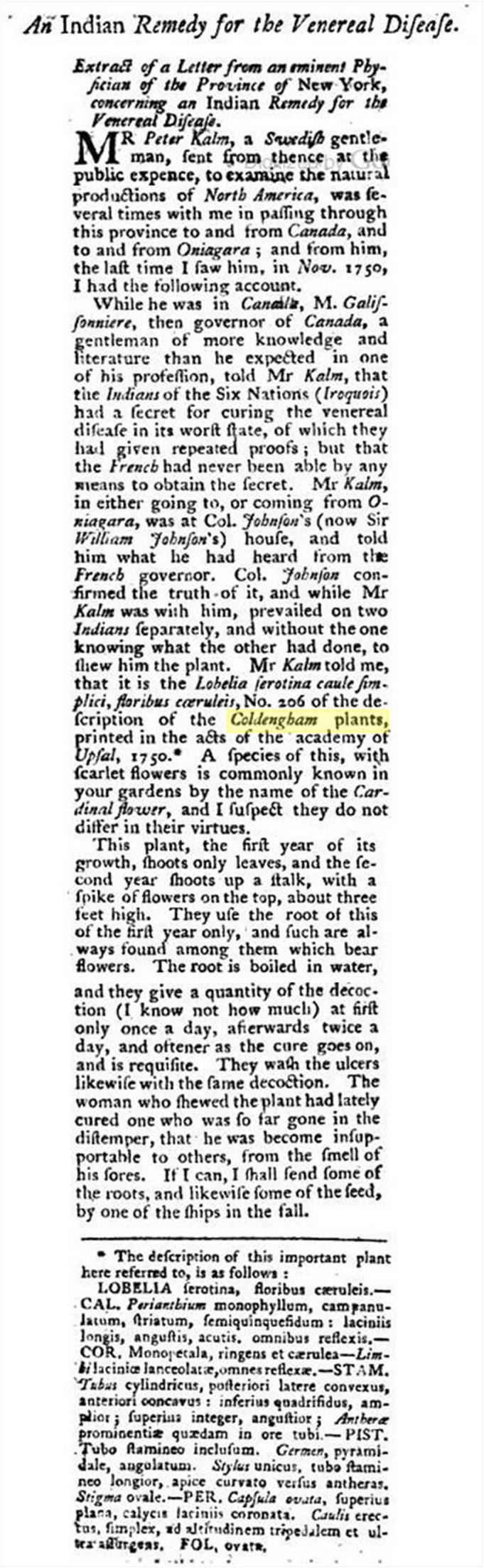 For the time being, this article published in Gentleman’s Magazine is provided to display the influences of Colden upon Kalm, as this appeared in the popular press. Kalm makes mention in passing about Colden’s two part treatise of plants of Nova-eboracensis (New York), produced from 1743 to 1747 and published by the Swedish Royal Society of Philosophy and the Sciences by 1749. As noted in the original article’s text, the end note is taken from Colden’s description of the Lobelia plant.