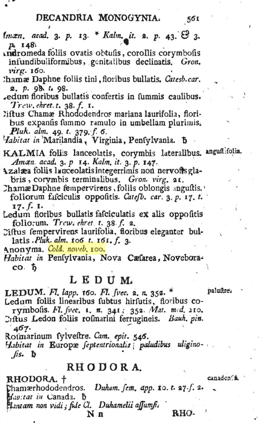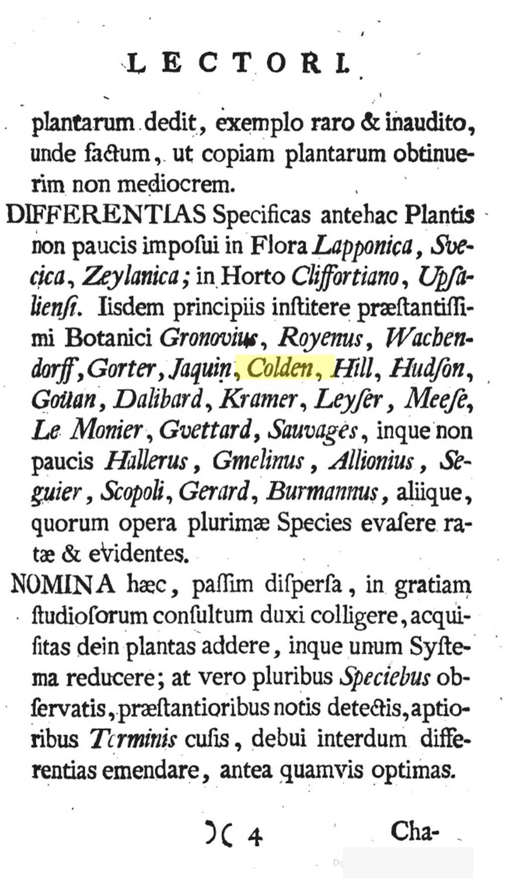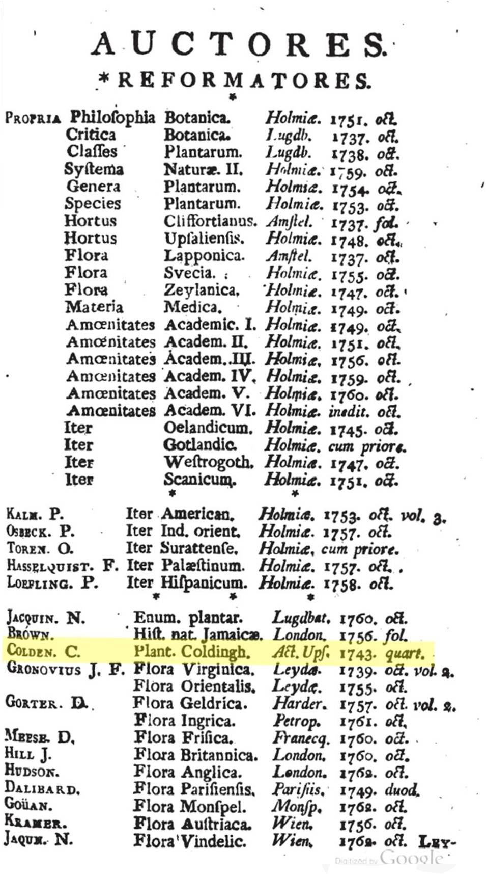 - This review of Colden writings includes two of the several plants which Colden entered into his treatise on Coldengham without any identification. These he referred to simply as the identifier Anonymi. With this review of Linne’s work, these two species noted by Colden can now be identified.