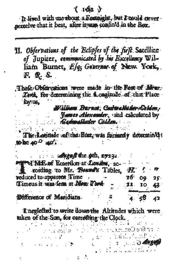 The following is the article of this event in its entirety (Article II, pp. 162-165). Note that Colden is not an author in this work. Instead, his name appears as part of the team involved in this celestial process.