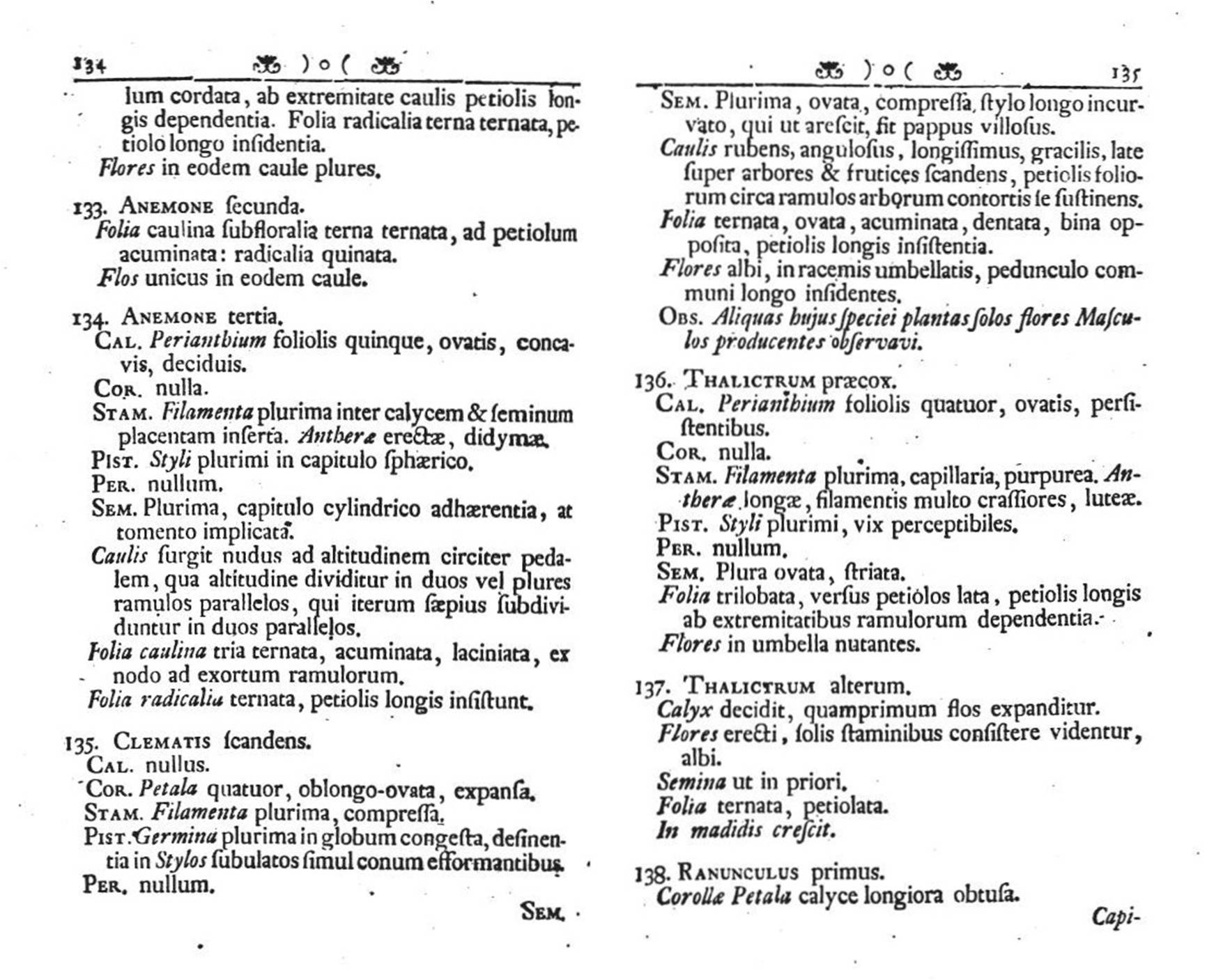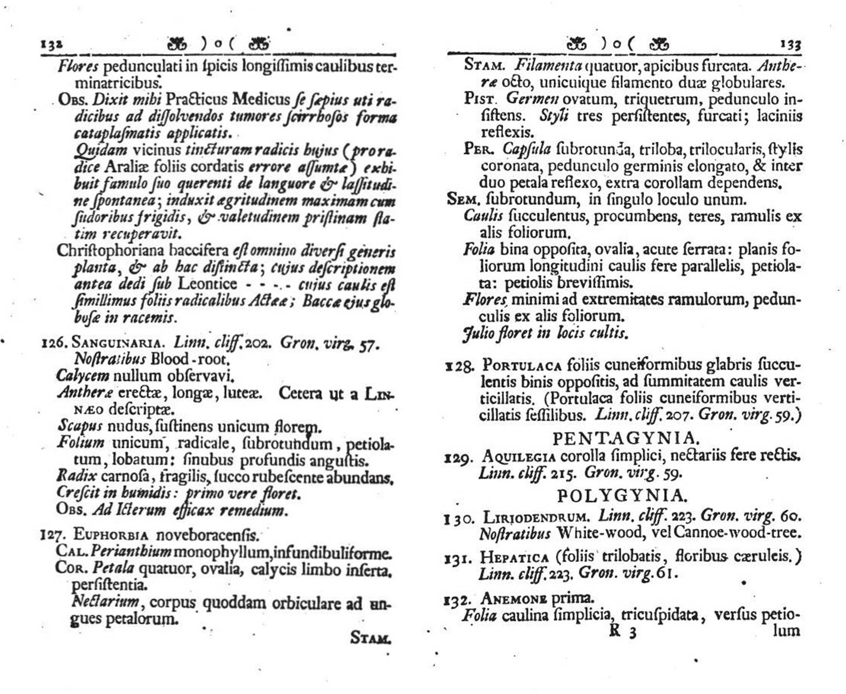 Also note in the above preface to Colden’s work, the preface author’s phrase “quas nullae ratione ad genera & species manadare potuit . . . Hac ratione Plantarum Coldenhamensium collectio nata est”. Roughly translated: ’and so this new naming [system/art] for plants–genus and species–as part of this study of the Coldenham plant collection–is born.’ The roles of Gronovius and Linnaeus within this process are referred to in the preface and appear throughout the taxonomic work in fairly standard format for this topic of writing for the time.