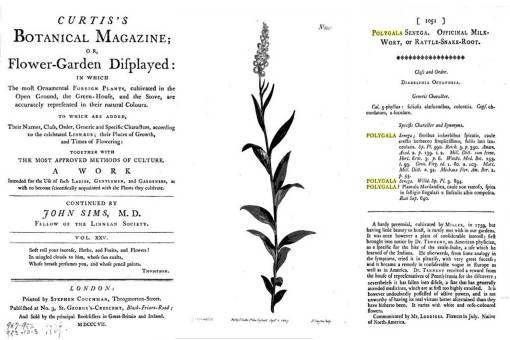 What is not really retold that well about Linne’s history is that he taught medicine, specializing in plant medicine, but also mineral remedies, and as a teacher on this topic, wrote a number of very important treatises on medicine and plants. The history, folklore and phenomenon associated with the Snakebite remedy was very much one of the most important of these topics, one of the few that he produced a complete treatise on and covered the varieties of examples of, be they Eurasian or New World in origin. Jane’s basic note about the local Snake remedy Polygala senega in New York, in combination with her father’s note about Black Snakeroot in his own two-part treatise a couple of years earlier, preceded by an important mid-Atlantic piece of history about the Virginia Snakeroot (Aristolochia serpentaria) as a snake cure, really made this an important topic he felt he had to pursue, and so he did.