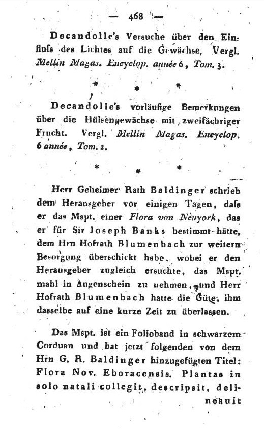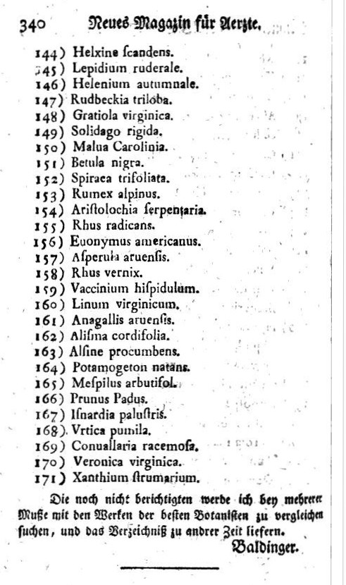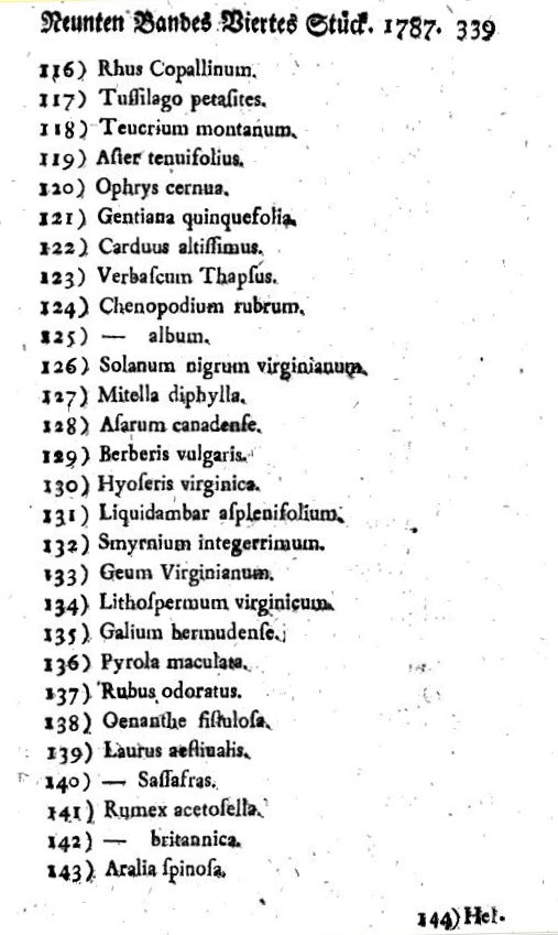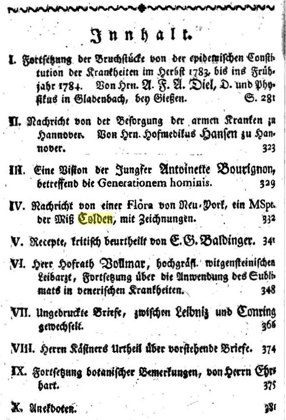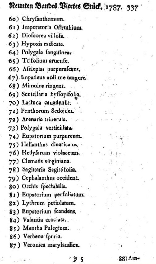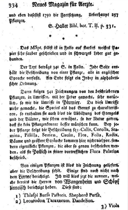 The first biography contains information which provides us with a history of Jenny’s pressed plant collection and manuscript, bringing us through the 1780s history of this work and providing us with some insights into the individuals whose hands it passed through on its way to Germany. According to the author of the 1787 article work published in News Magazine for the Arts, Jane’s manuscript was a collection of 341 sheets of paper, of which about 170 have complete plant descriptions. The second biography is based upon a review by Stephen Britten [of the Britten and Brown series on local flora] of previous writings published about Jane’s work in the German documents, especially those authored by Pritzel, which are reviewed on a separate page.