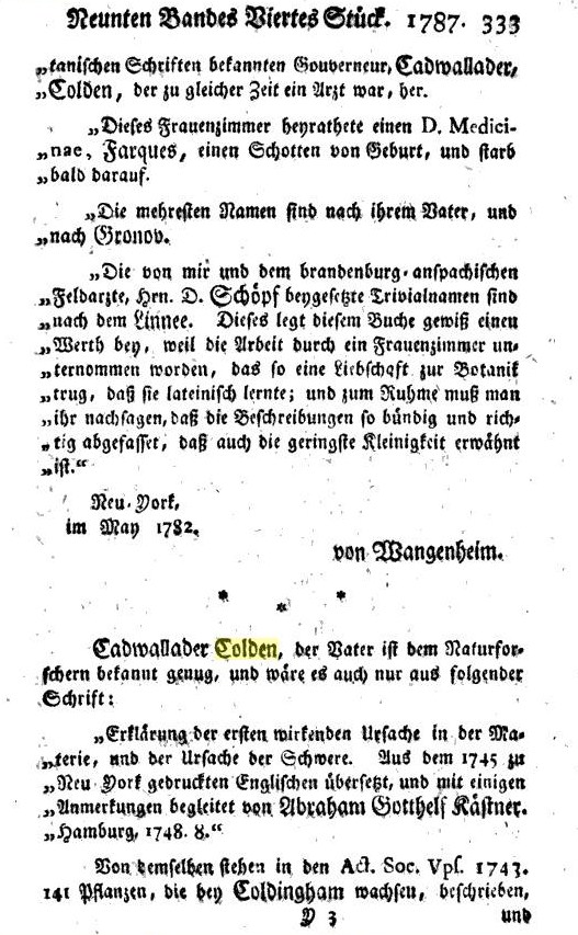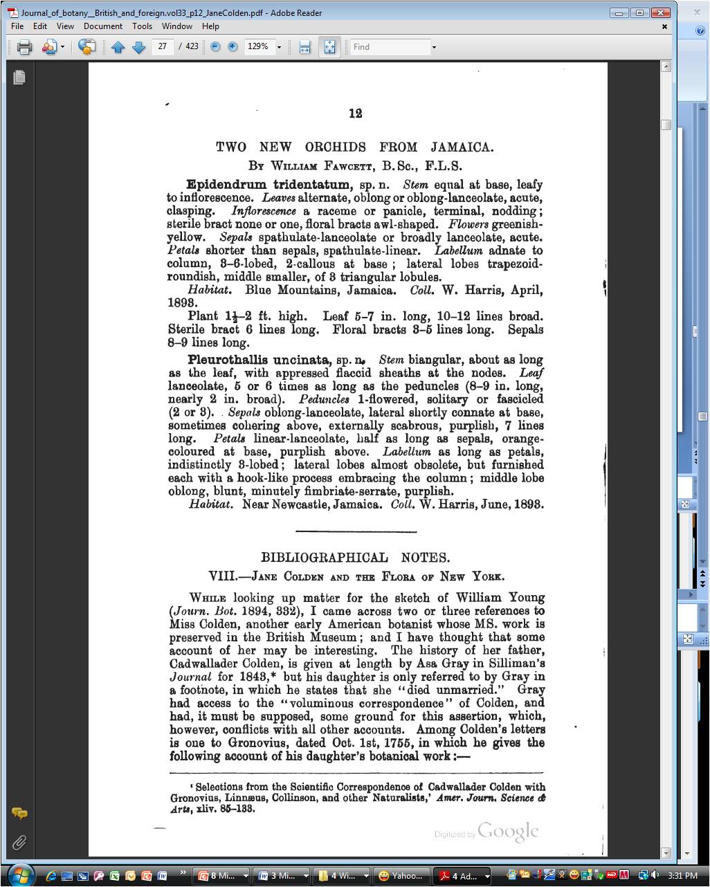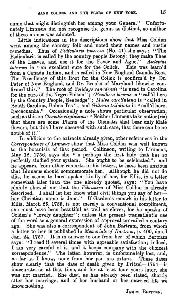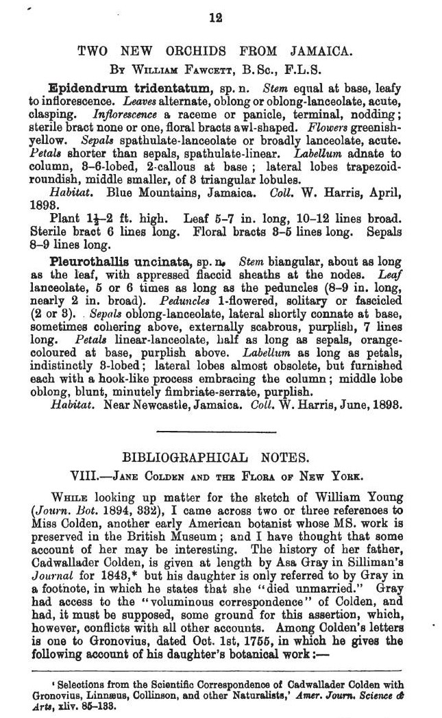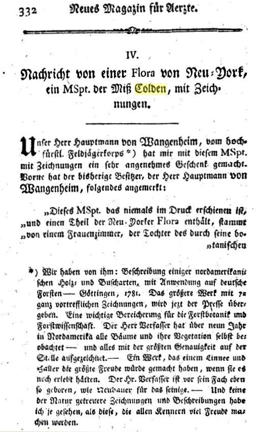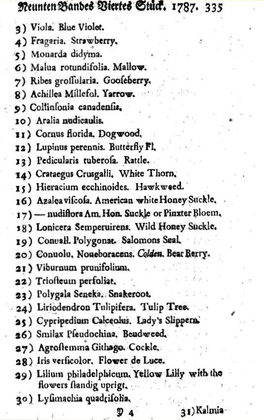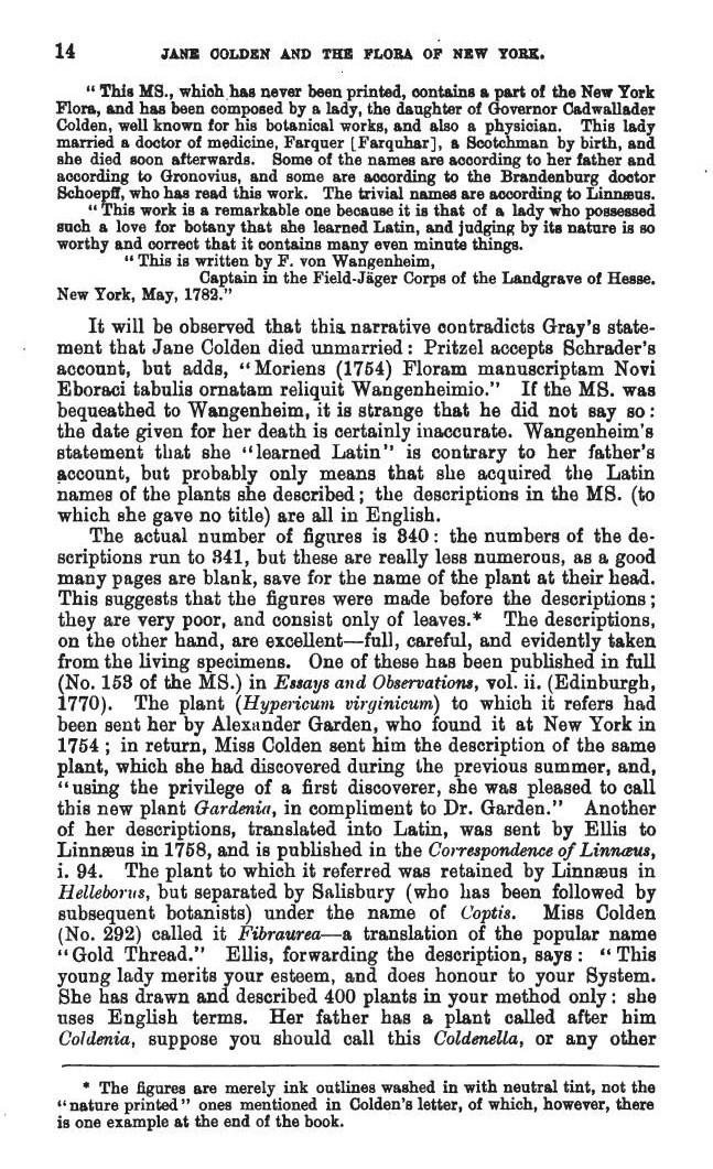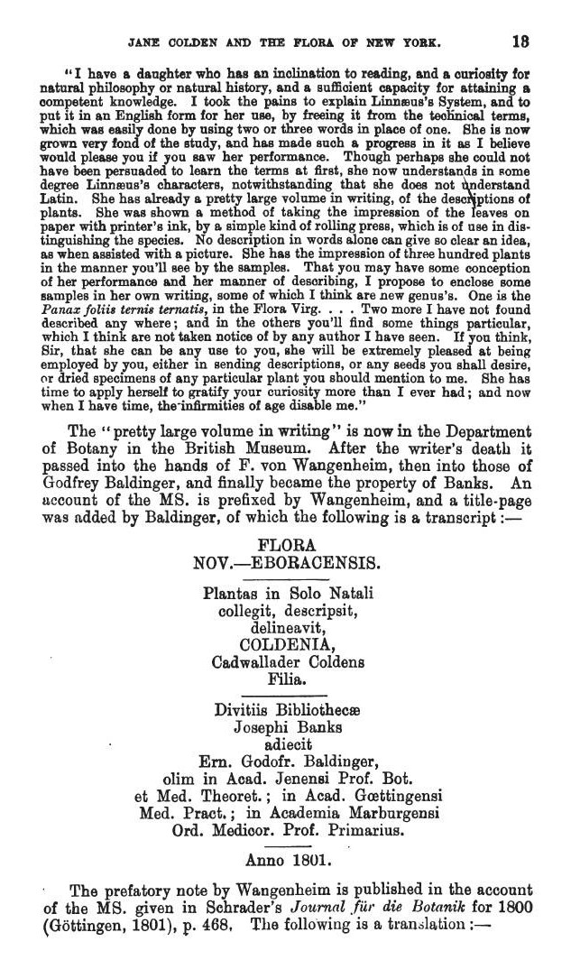 The most important thing to note here about the first description of Jane’s work is the listing of plants provided, and the detailed history of her manuscript provided in several footnotes and in the main text of this work. Along with Cadwallader’s work, this is the earliest detailed description of plants native to Coldenham, and similar parts of the Hudson Valley.