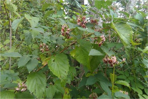 The Staphylea (Staphylaea) trifolia L. or the three-leaved bladdernut tree, as Jane would call it, also went by the common name rattle-box. This is due to the sound it makes in the fall when the small seeds, which look like kernels of corn, loosen from the pod that surrounds them, thereby making a rattling sound whenever it gets windy. Just what uses there were for this plant during the colonial time in the Hudson Valley remain uncertain for now. This plant has relatives in Europe, and so some uses may have stemmed from the knowledge of these other species.