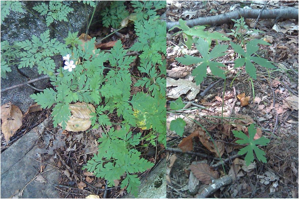 The logical follow-up to the tannin rich oaks is the discussion of another tannin-source-the wild geraniums. There are numerous species of wild geraniums–Geranium maculatum L. (wild cranesbill, image to the right below, native to North America) and G. robertianum L. (herb robert, image to the left below, introduced or escaped from colonial gardens)—these two are perhaps the most abundant local species. Geranium maculatum L. has a distinct leaf form, as does G. robertianum L., although the latter leaf, since it is milliform (appearing “lacey”, or very much divided into small feathery lobules), can be mistaken when found without a flower in the woods. In general, cranesbill likes to grow along forest floors, well shaded, and herb robert, along forest floors close to forest edges and especially along taluses–those rock collections formed by boulders at the base of a steep forested mountain edge or tree-covered hillside totally contained within a well-shaded forest setting.