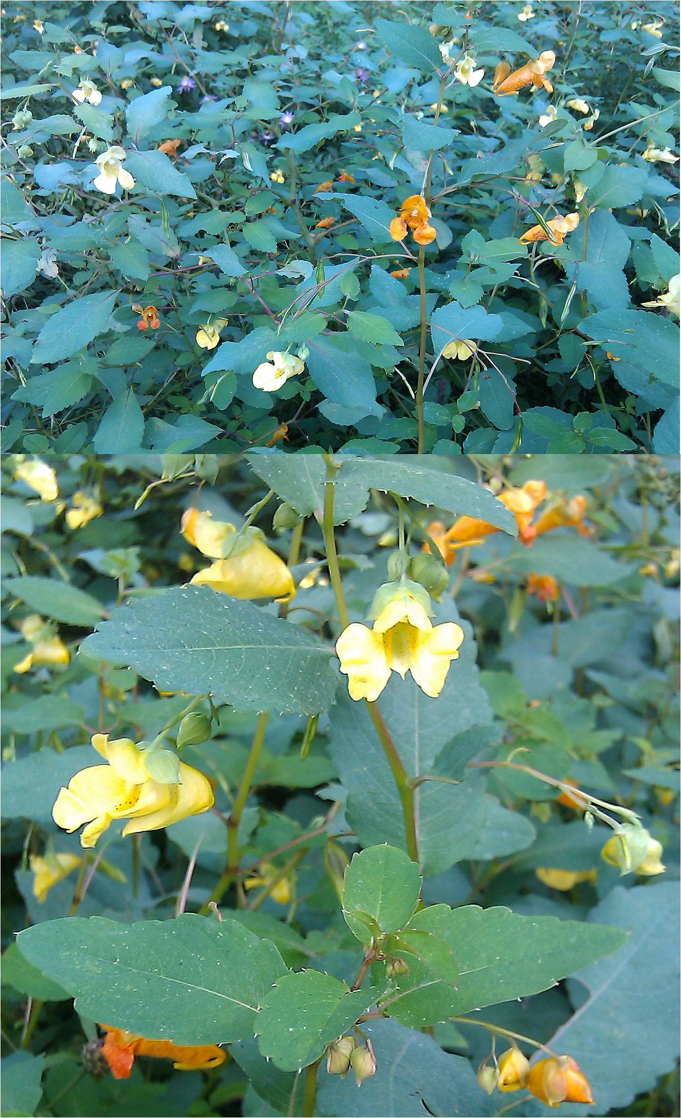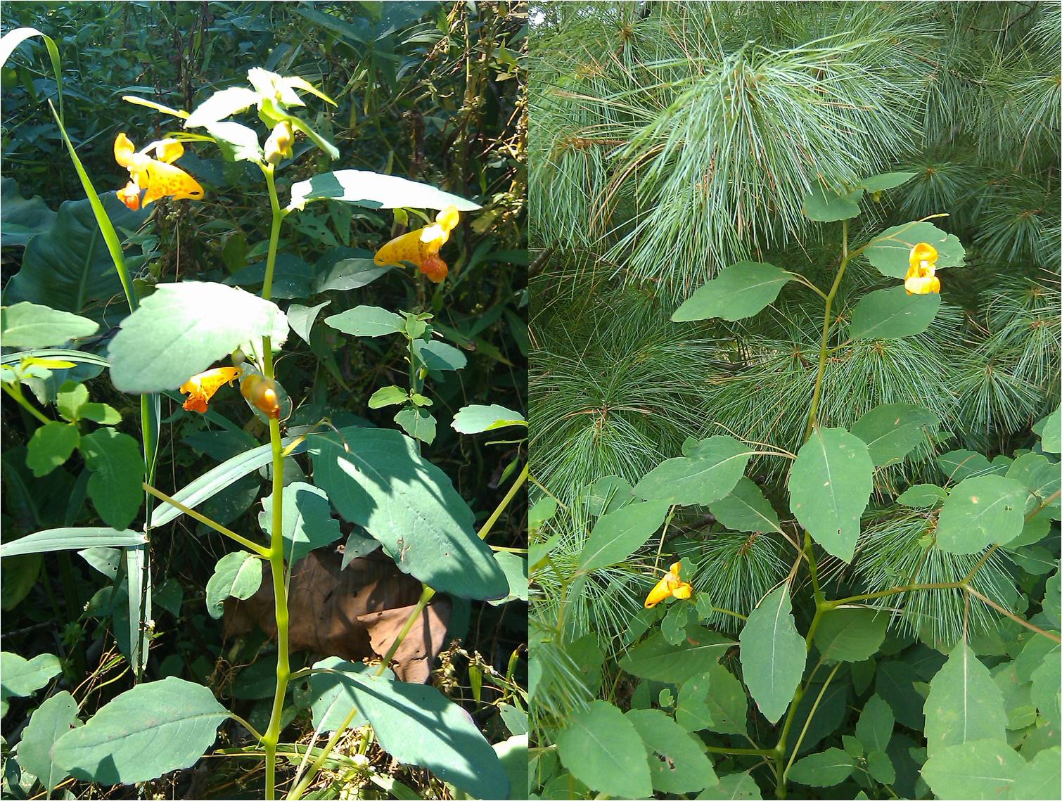 In the photographs below, both species are seen growing in close proximity to each other: Impatiens flava (yellow) and I. fulva (orange). The yellow species was documented by Nuttall during the very early 1800s.