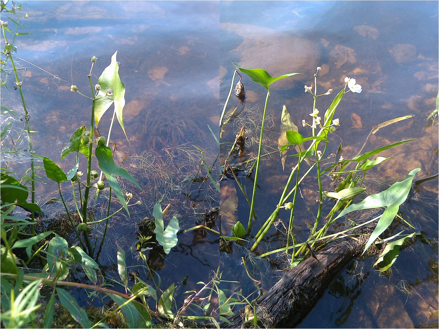 Locally, there are two species of Sagittaria, one with a broad leaf like the one that Jane discusses (Sagittaria latifolia Willd.), and the other with a very thin leaf blade (S. sagittaefolia L.).